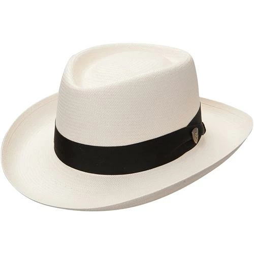 The Basino, from The Dobbs Shantung Collection of straw hats, features a 3″ rolled up brim and a 4 1/4″ gambler crown. This hat is stiff so your brim will stay in its original shape. This hat comes with a solid black fabric band and a Dobbs hat pin. Inside, you’ll find a genuine cowhide sweatband for added comfort.ย Made in the USA.