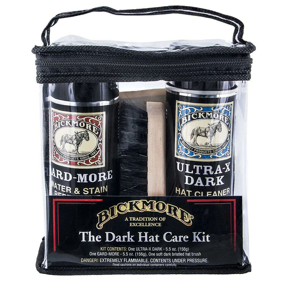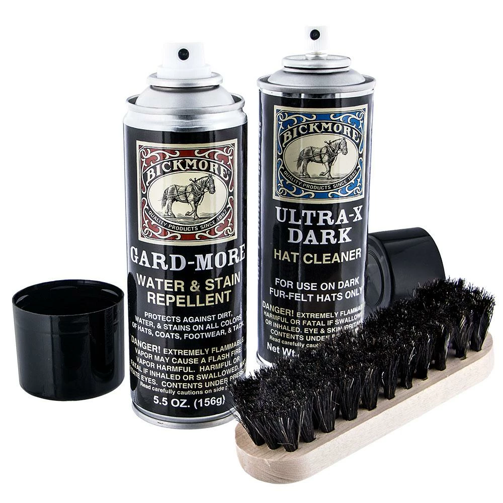 When you own a felt hat, one of the most important products to have is a good kit for properly caring for it. Bickmore’s dark felt hat care kit is a must. It includes two cans that include 5.5 ounces of cleaner and repellent. Specifically, you get the Gard-More water and stain repellent spray and Ultra-X Dark hat cleaner.