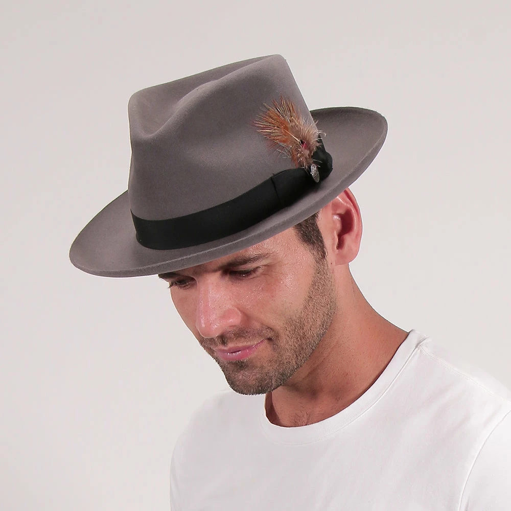 Look as dignified as you are confident with this Chatham Fur Felt Fedora Hat by Stetson. As you slip the Chatham Stetson Fur Felt Fedora onto your head you will notice the soft feel of the Fur Felt material. The multi-colored feather, narrow band and stetson pin adds a fun yet refined look to this sexy notable hat.