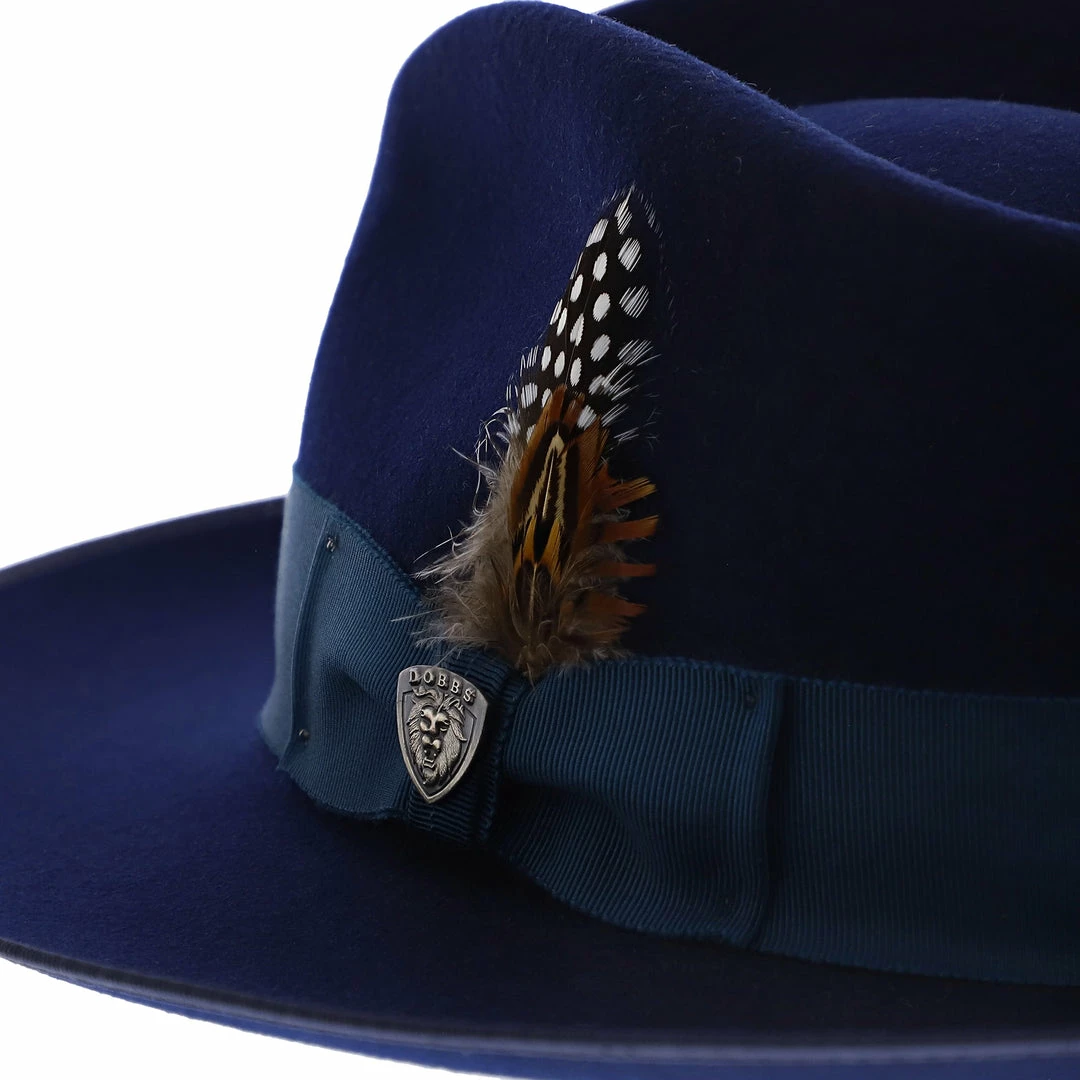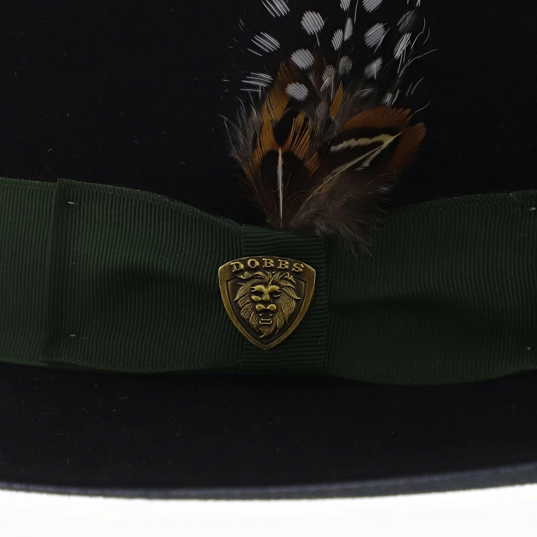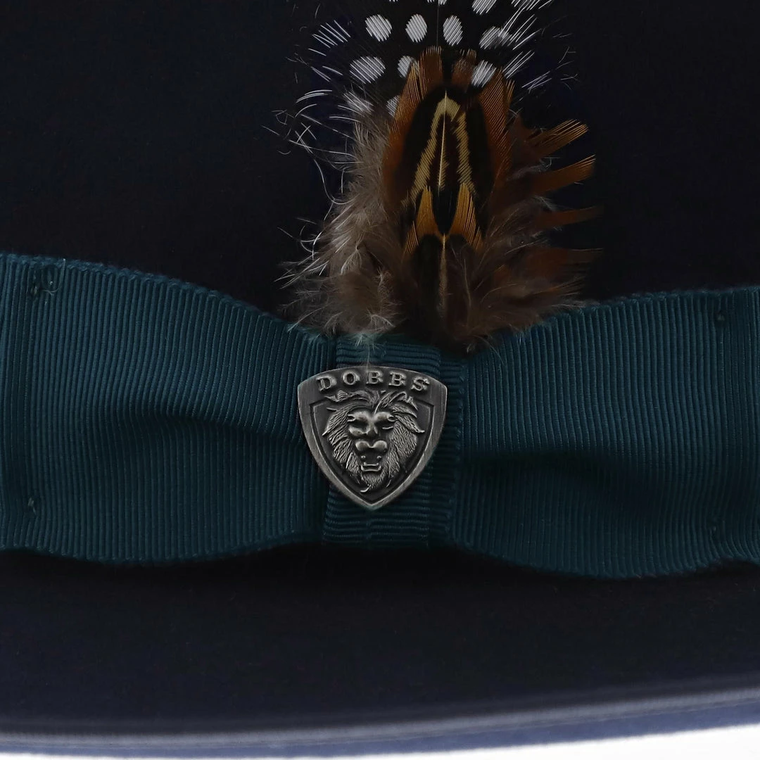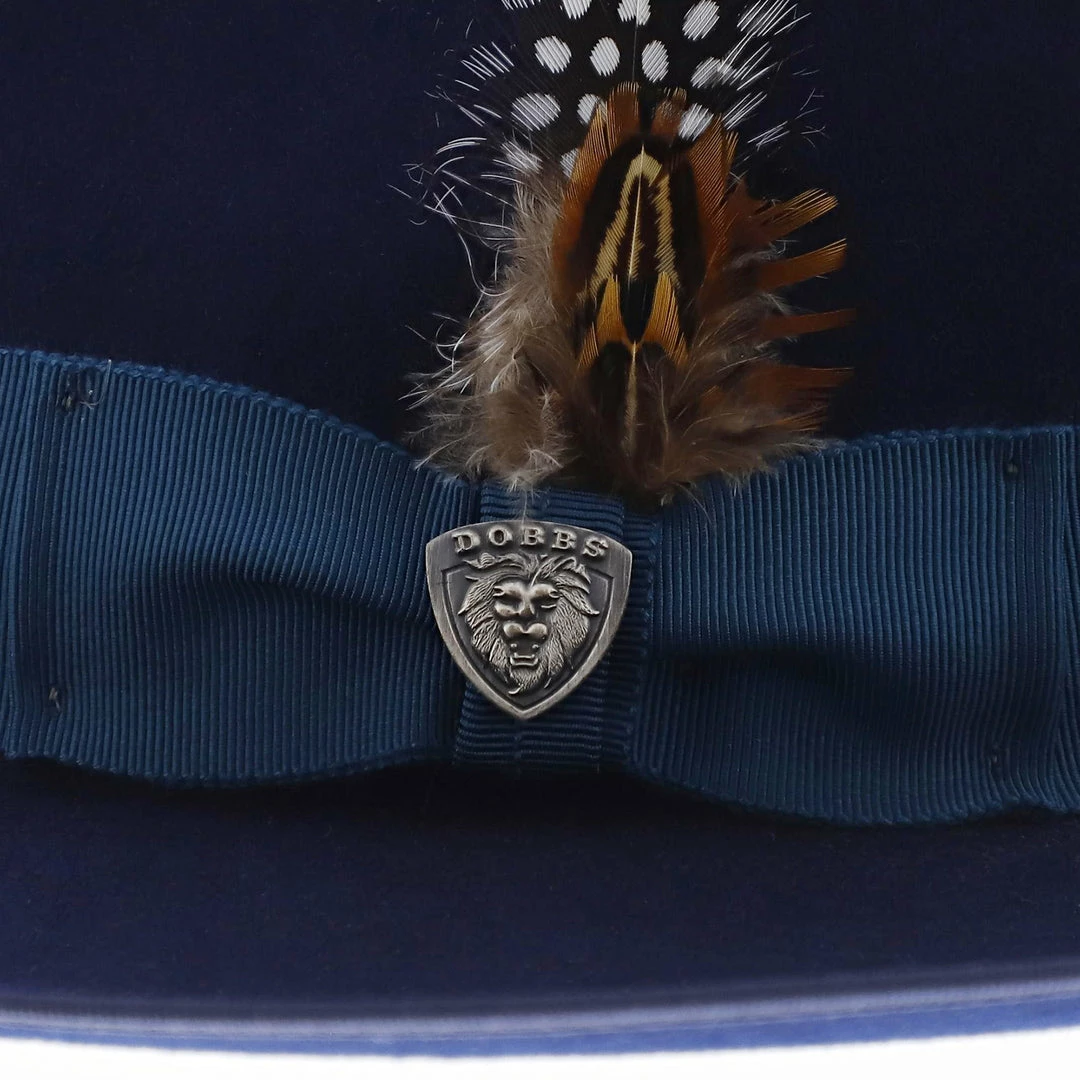 Made in the USA this limited edition Dobbs fedora is made of 100% wool felt and trimmed with a grosgrain ribbon band. Each brim is bound in matching grosgrain ribbon with feather accents. Adorned with a metal Dobbs Hat pin, this stunning fedora is finished with satin lining and DRI-LEX® sweatband for comfort.