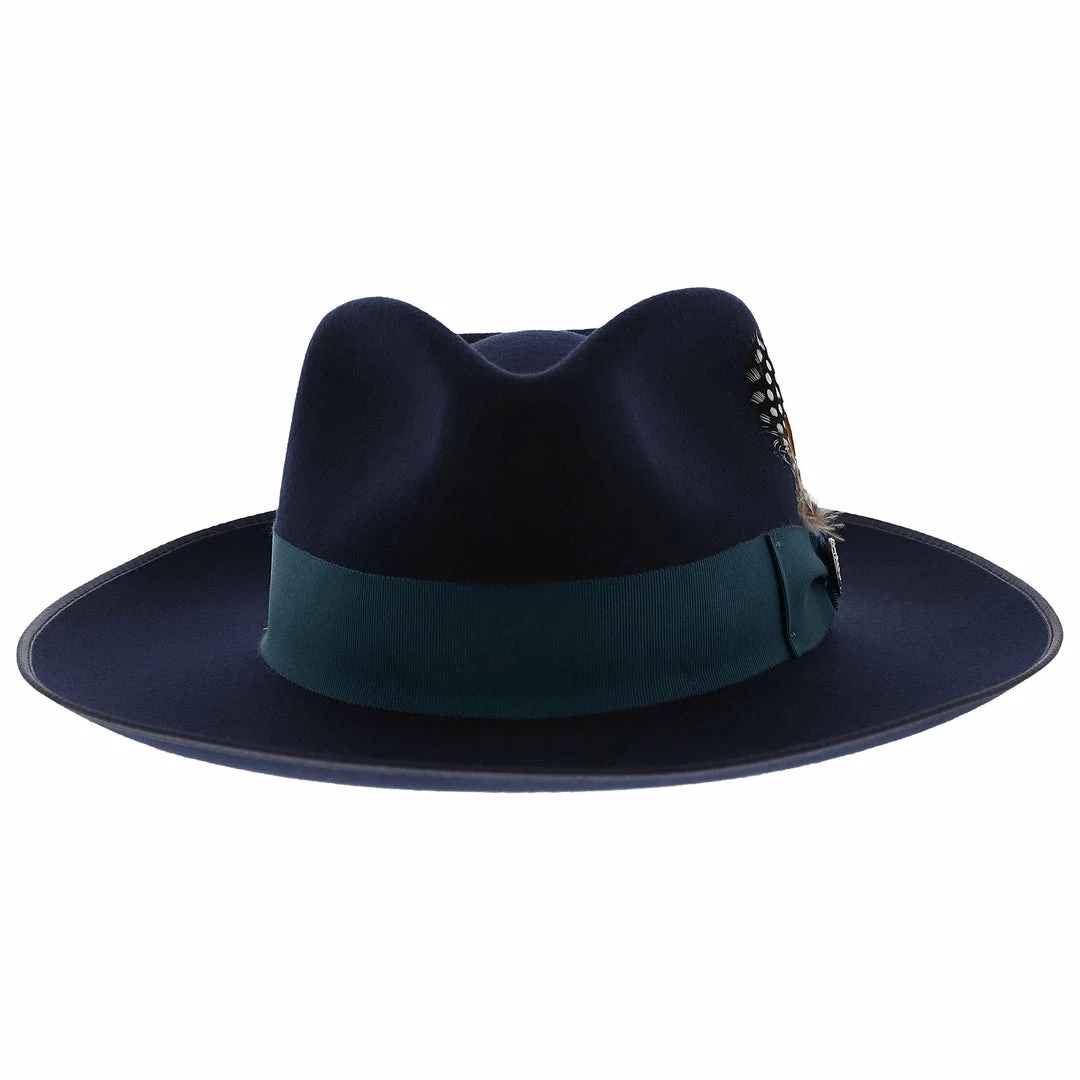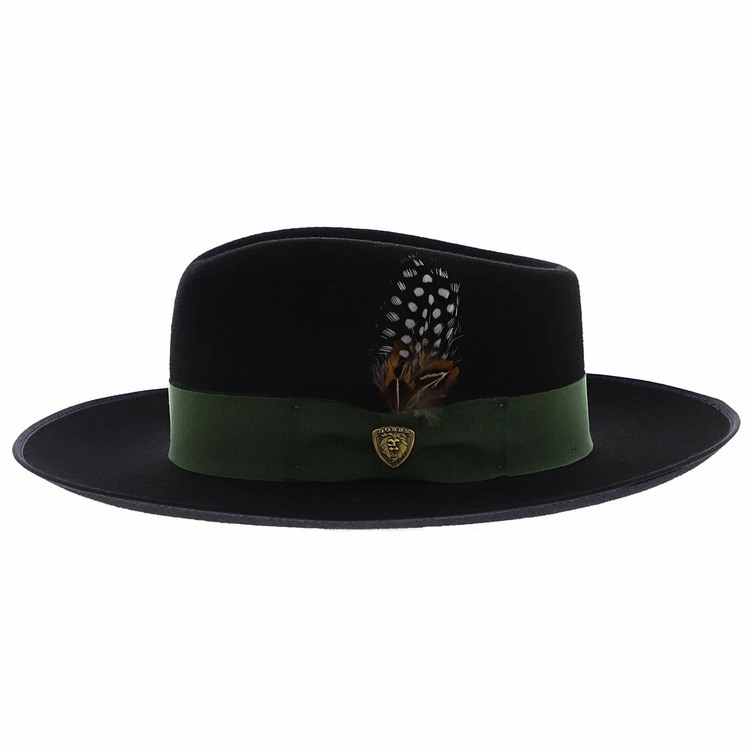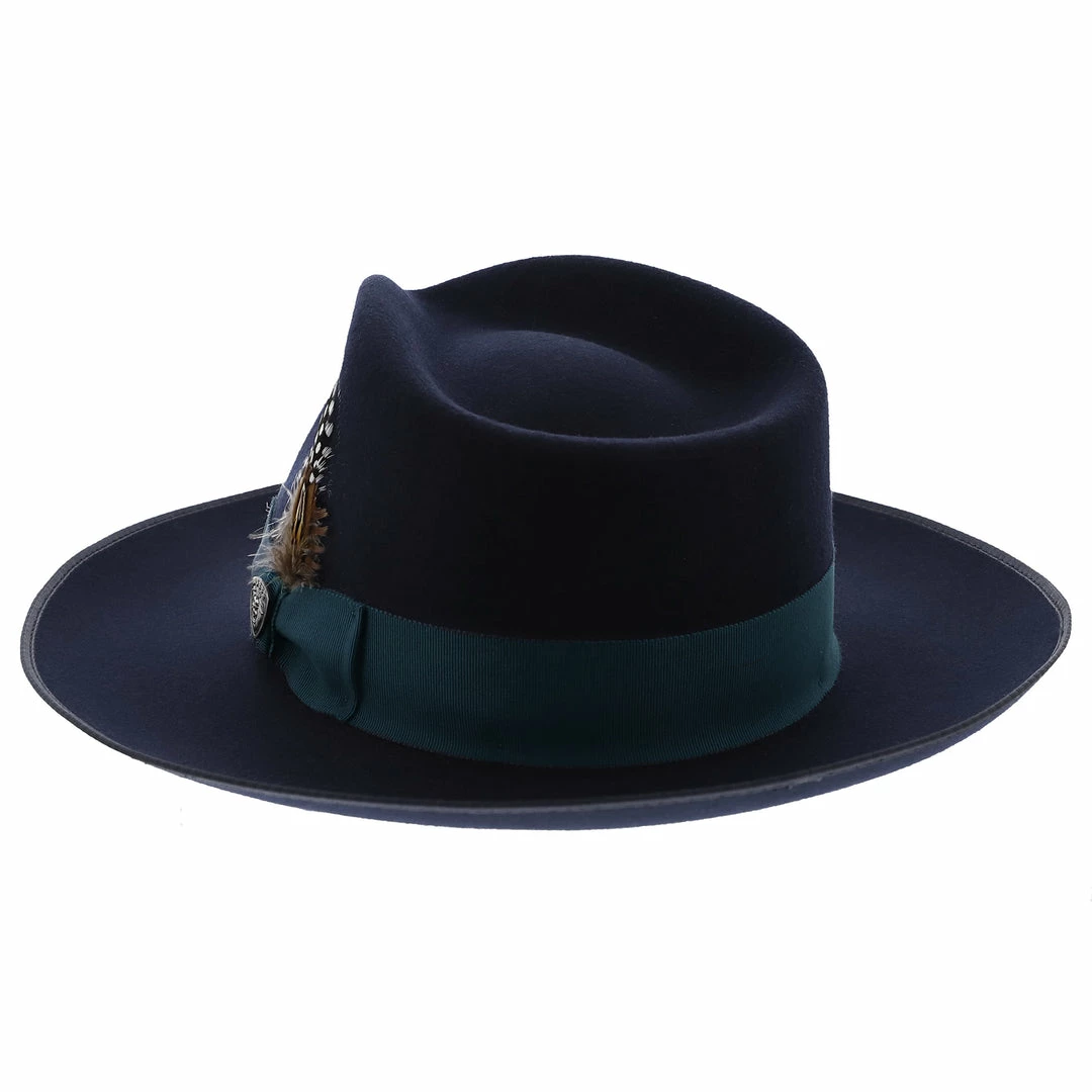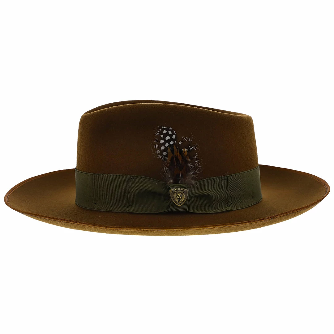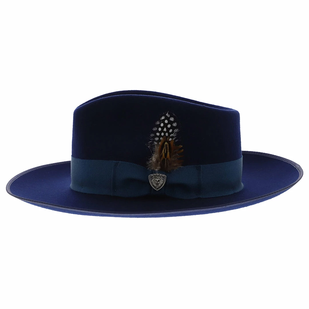 Made in the USA this limited edition Dobbs fedora is made of 100% wool felt and trimmed with a grosgrain ribbon band. Each brim is bound in matching grosgrain ribbon with feather accents. Adorned with a metal Dobbs Hat pin, this stunning fedora is finished with satin lining and DRI-LEX® sweatband for comfort.
