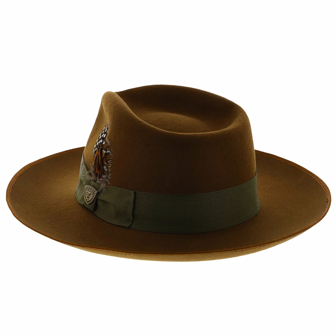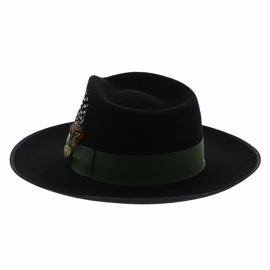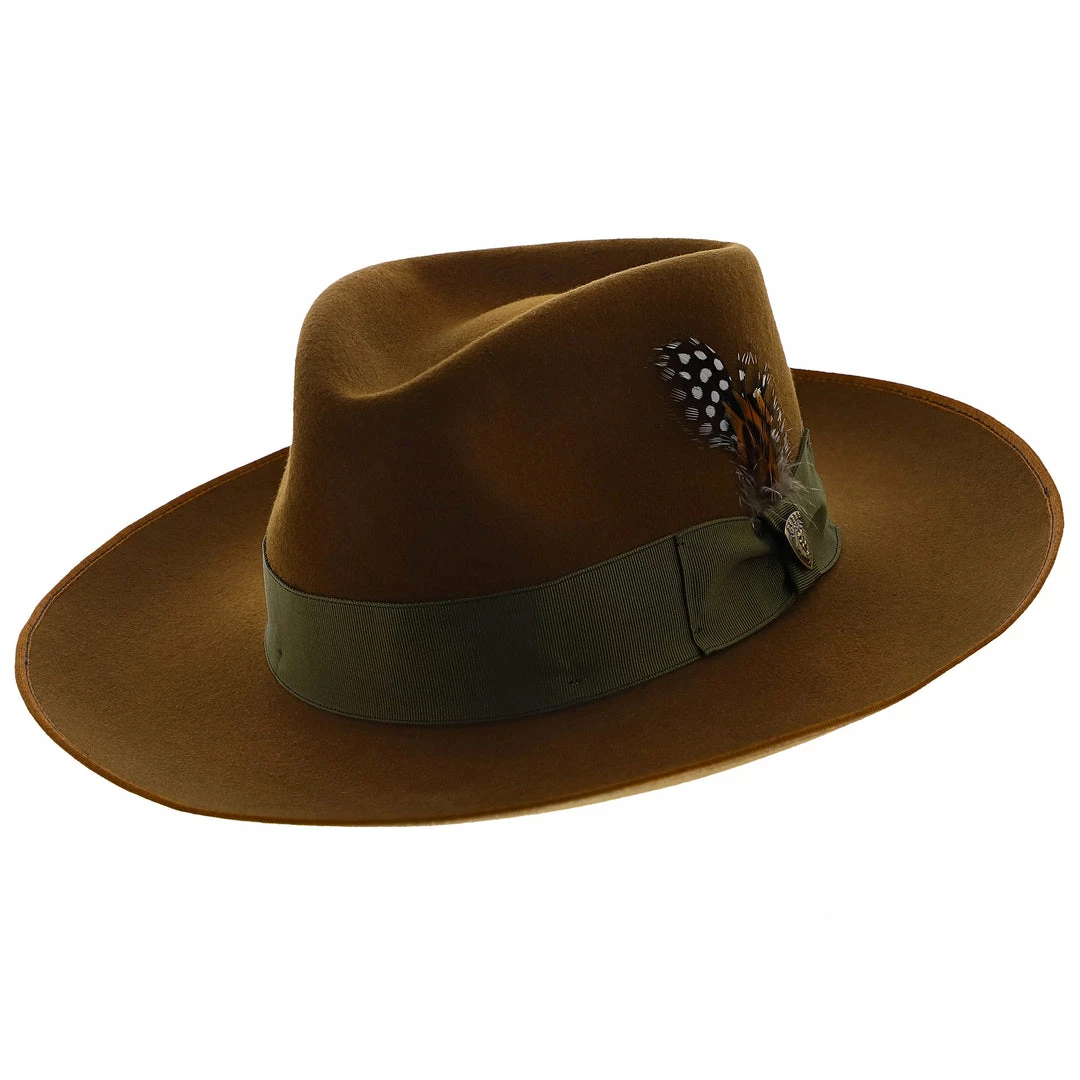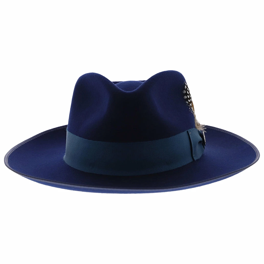 Made in the USA this limited edition Dobbs fedora is made of 100% wool felt and trimmed with a grosgrain ribbon band. Each brim is bound in matching grosgrain ribbon with feather accents. Adorned with a metal Dobbs Hat pin, this stunning fedora is finished with satin lining and DRI-LEX® sweatband for comfort.