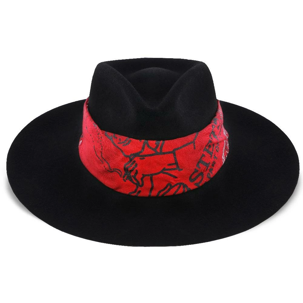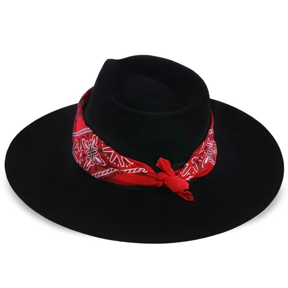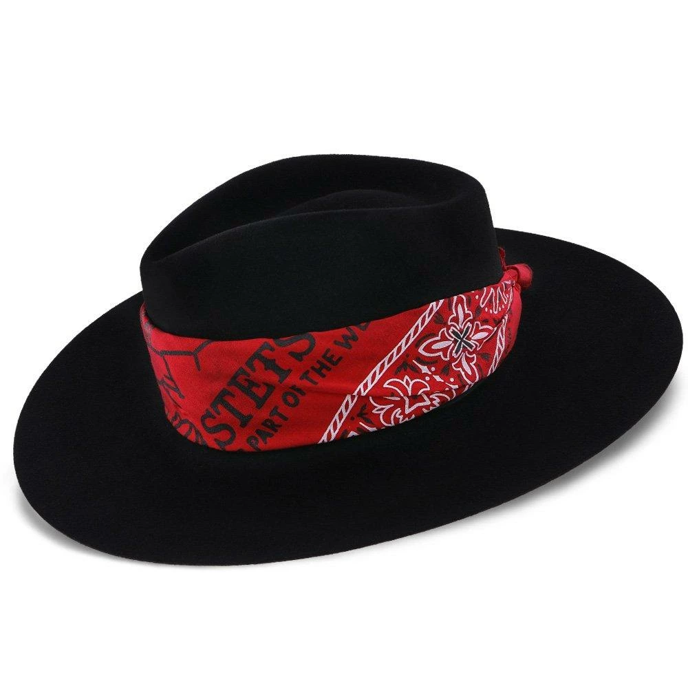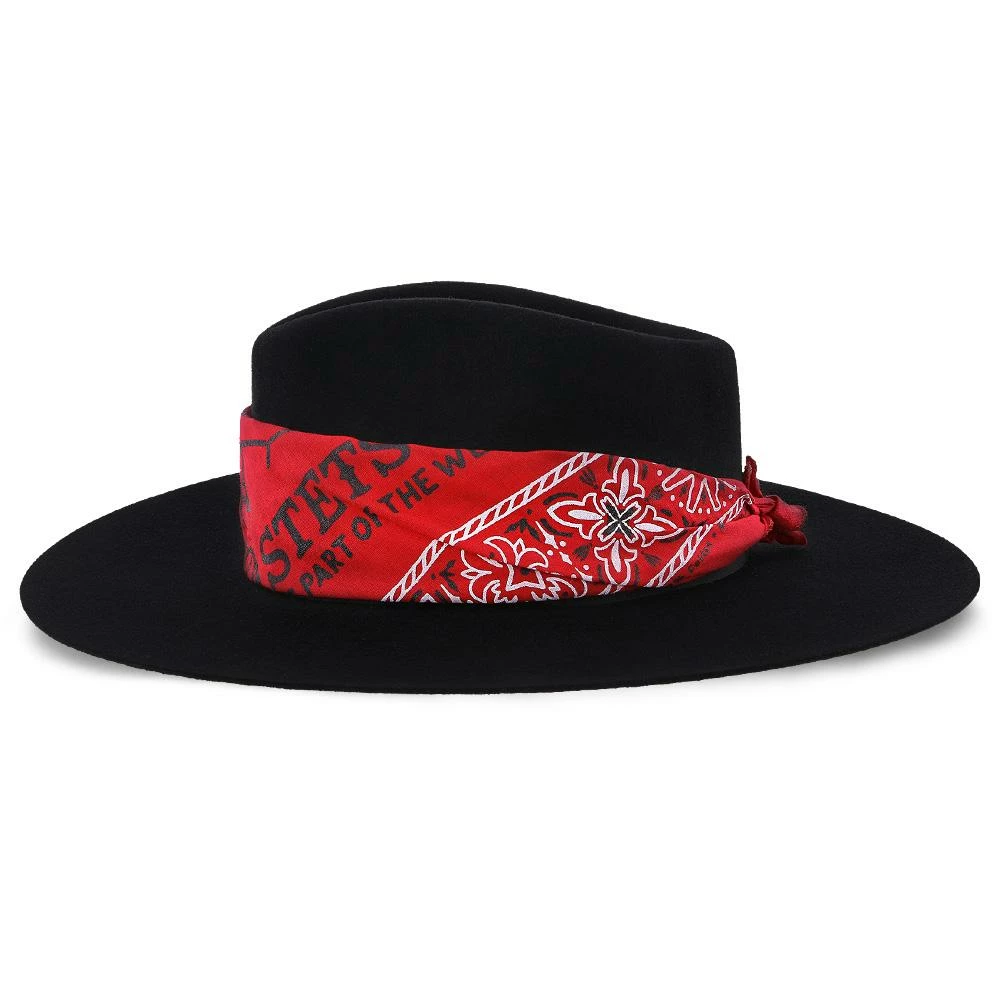 Our Stetson D Blanco black wool felt hat has a wide brim and pinched front. The fun, brightly colored bandana, which is removable, creates a hat that is cheerful and pleasant. Throw on a flowing skirt and boots for a cute Annie Hall look, even though this hat is classified as a man’s hat. Men can top a pair of jeans and a loose-fitting t-shirt with this hat to give them a kind of “rocker†look while traveling around town. The hat is created from wool felt and is extremely durable.