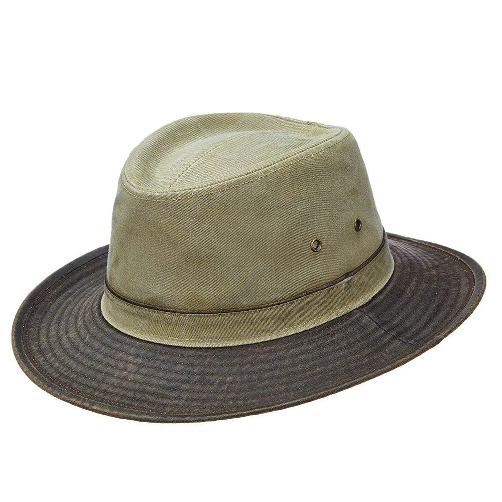 This unique safari-style hat from Dorfman Pacific will keep you cool and collected on your travels. The fabric of the crown mimics the look of blue denim to create a striking contrast with the brown faux-leather brim. The lofty 4.5รขโฌย crown sits stylishly atop the stiff 2.5รขโฌย brim which provides the perfect amount of coverage from the sun. The Navy Pigmented Dyed Twill Safari Hat is light and breathable, making it the perfect choice to wear while doing yard work, boating, or simply sitting outside and enjoying the sunshine.