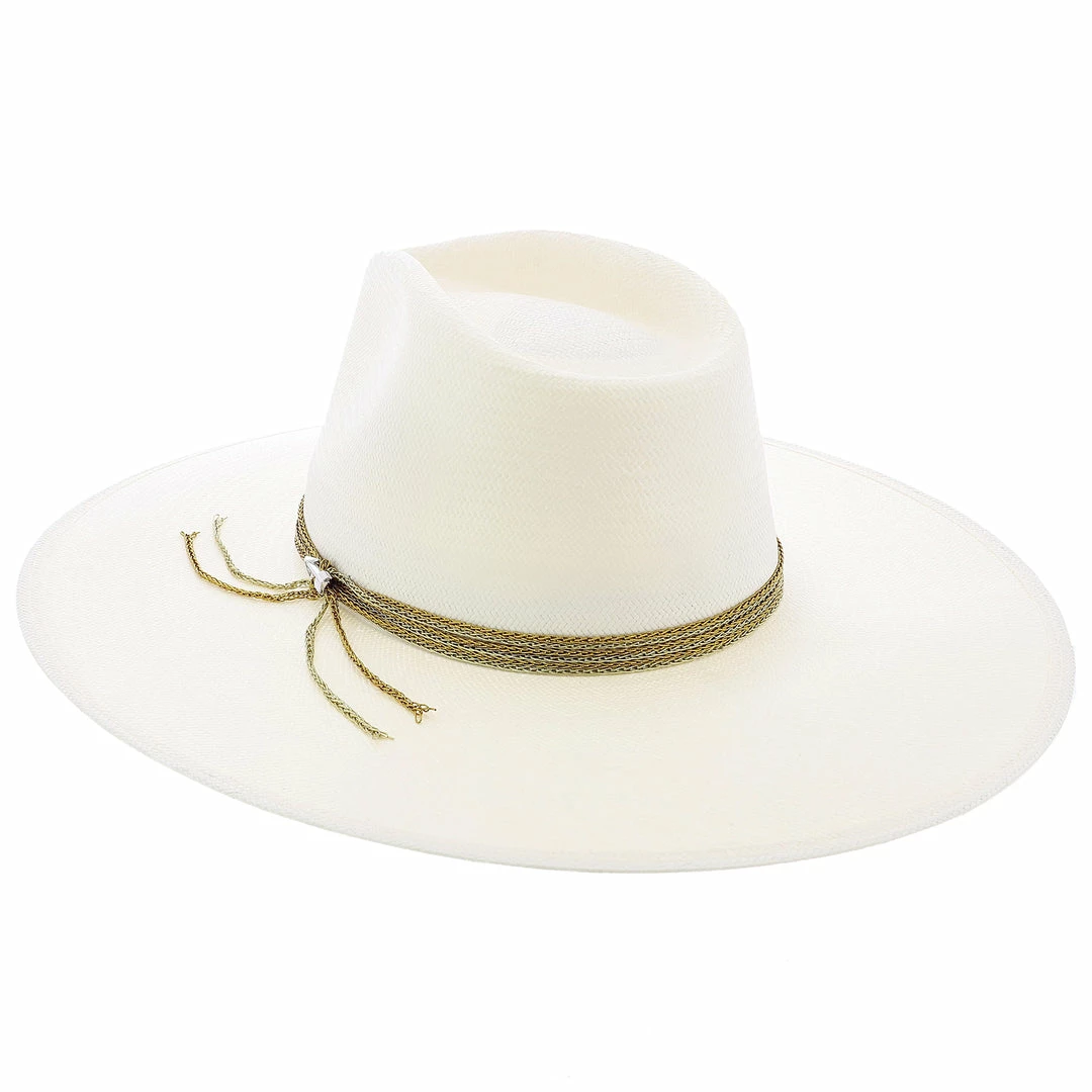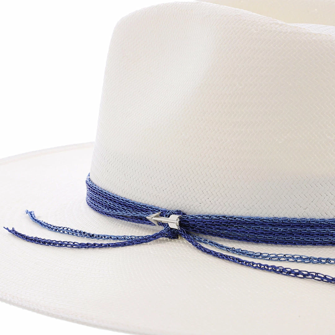 This firm straw wide brim fedora hat has a 4″ brim and a 4″ crown. Available in two exquisite band colors blue and gold. The Hardrock has a beautiful chain link style hat band secured together arrow hat pin which is a perfect compliment to this hat.