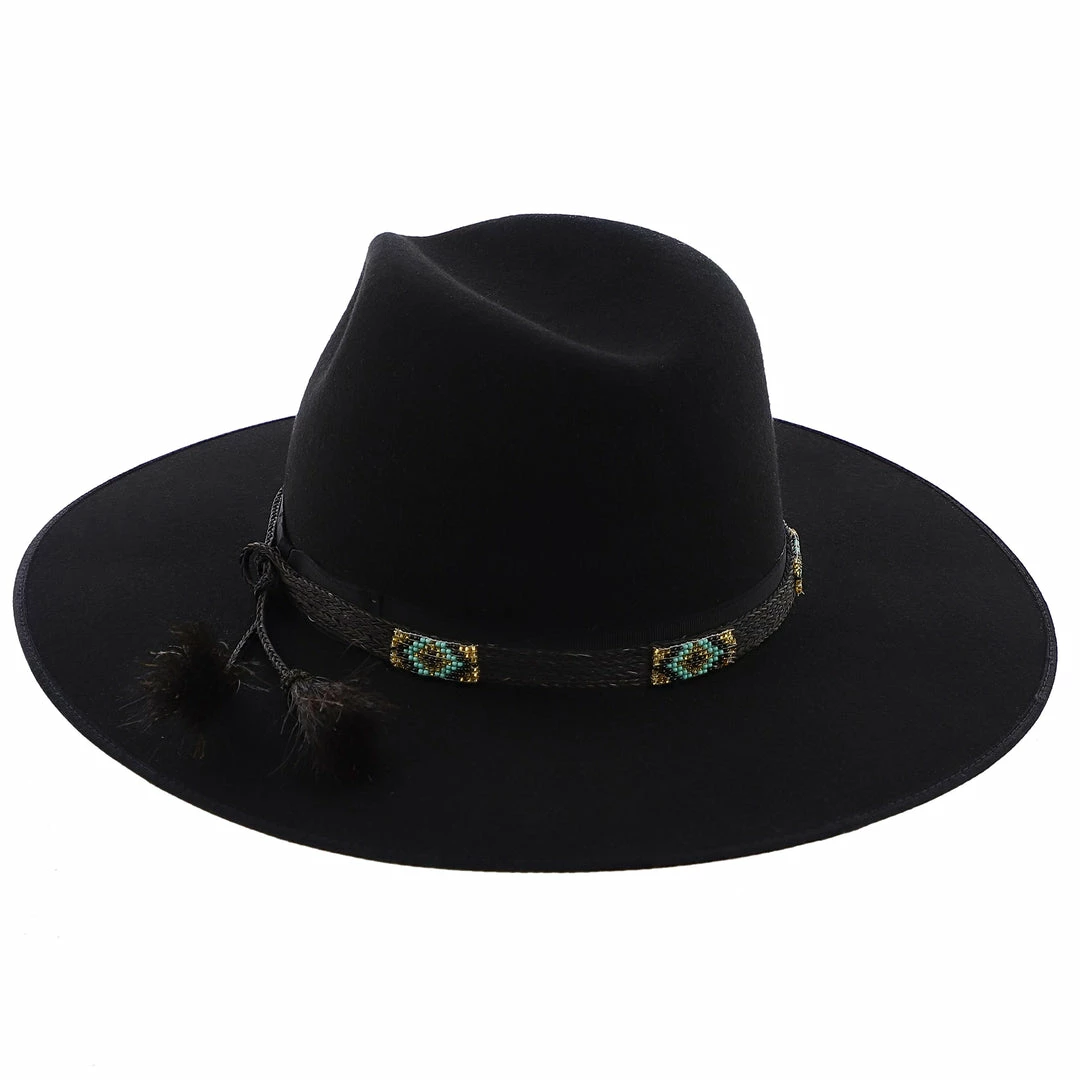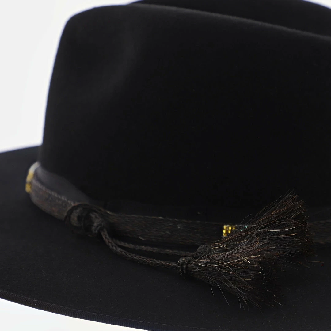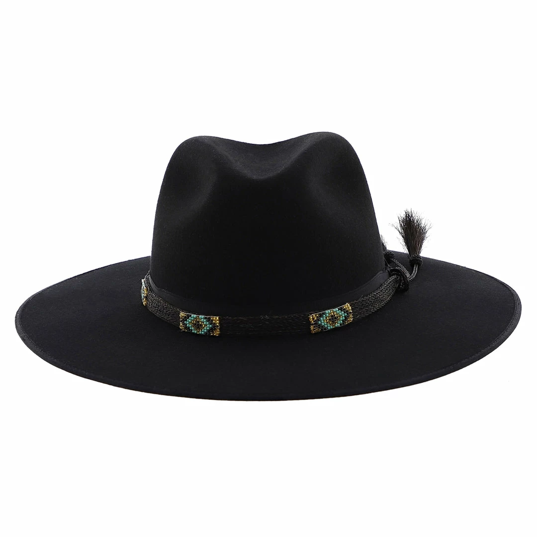 Stetson’s Seeker collection brings to you a celebration of craftsmanship with the Helix Wool Felt Fedora Hat! Made in the USA this firm black wool felt hat has a 3 3/4″ bound edge brim with a handwoven horsehair and beaded hat band overlaying a grosgrain ribbon. The horsehair tassels add an extra bit of flair while the faux leather sweatband and satin lining add comfort. The Helix has a stiff build and will elevate any outfit.