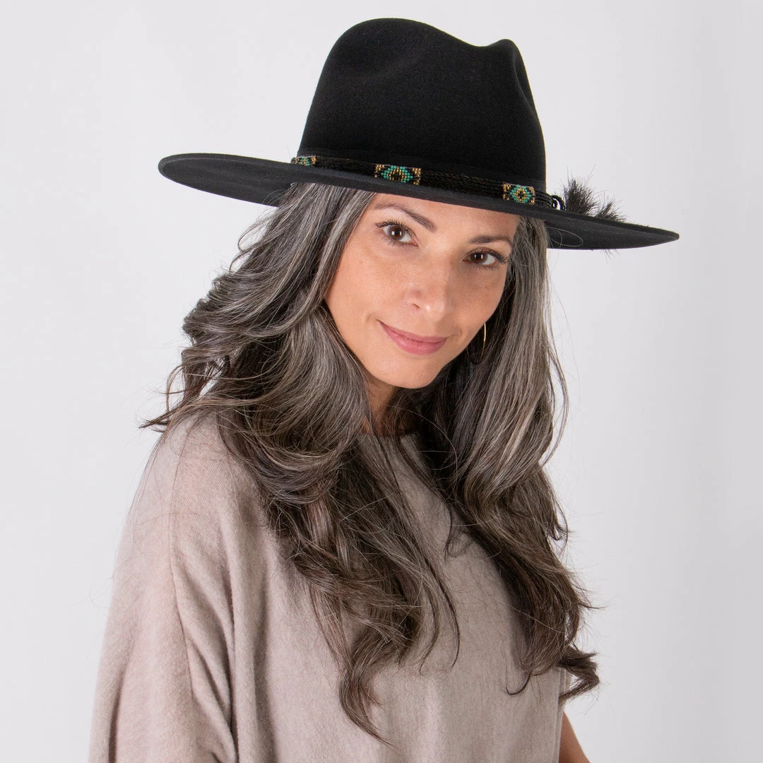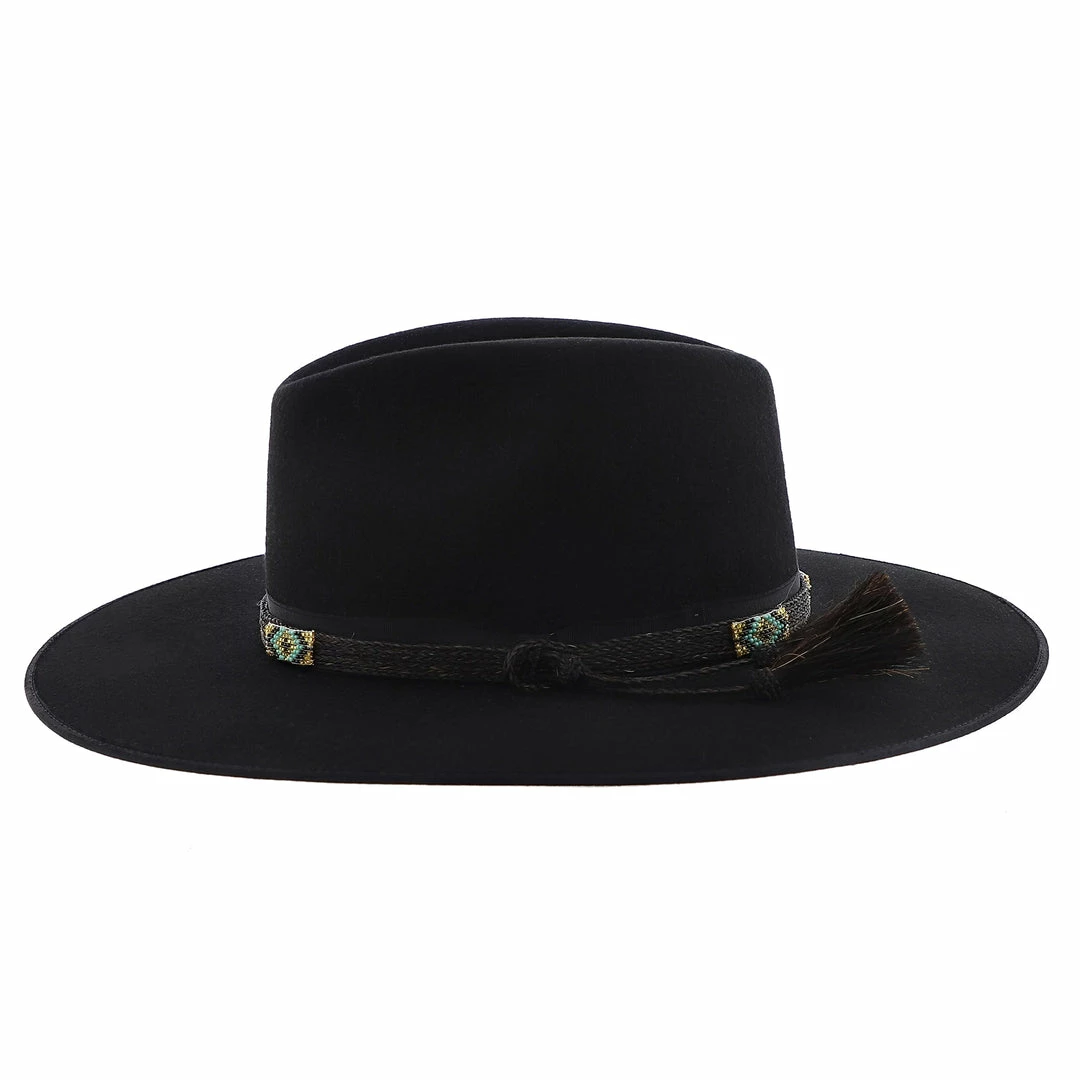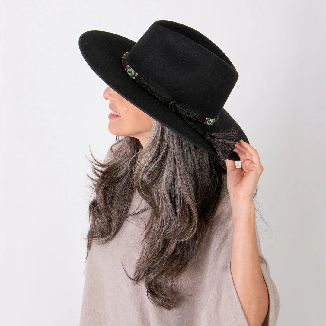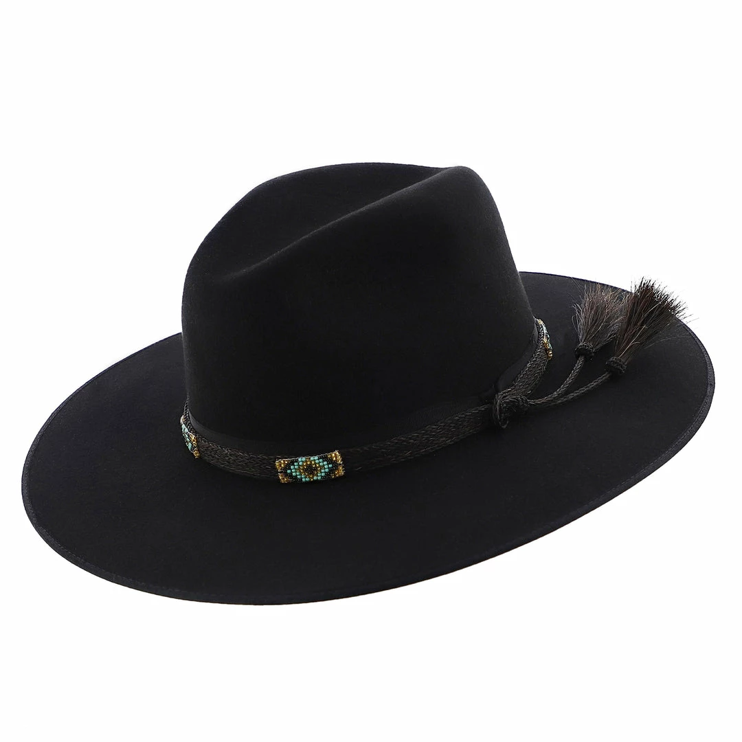 Stetson’s Seeker collection brings to you a celebration of craftsmanship with the Helix Wool Felt Fedora Hat! Made in the USA this firm black wool felt hat has a 3 3/4″ bound edge brim with a handwoven horsehair and beaded hat band overlaying a grosgrain ribbon. The horsehair tassels add an extra bit of flair while the faux leather sweatband and satin lining add comfort. The Helix has a stiff build and will elevate any outfit.