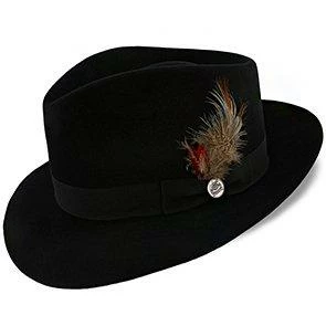 The Downs Stetson Fur Felt Fedora is just what is needed to boost your evening attire to the debonair level! A Stetson brand fedora with a C-Shaped crown, featuring a 2.5″ brim, made from a fur felt blend in black and a leather sweatband inside is all the hat you will need for a sleek classic look and feel. When you add the 1″ satin band and the fun feather accent this is the only choice in headwear!