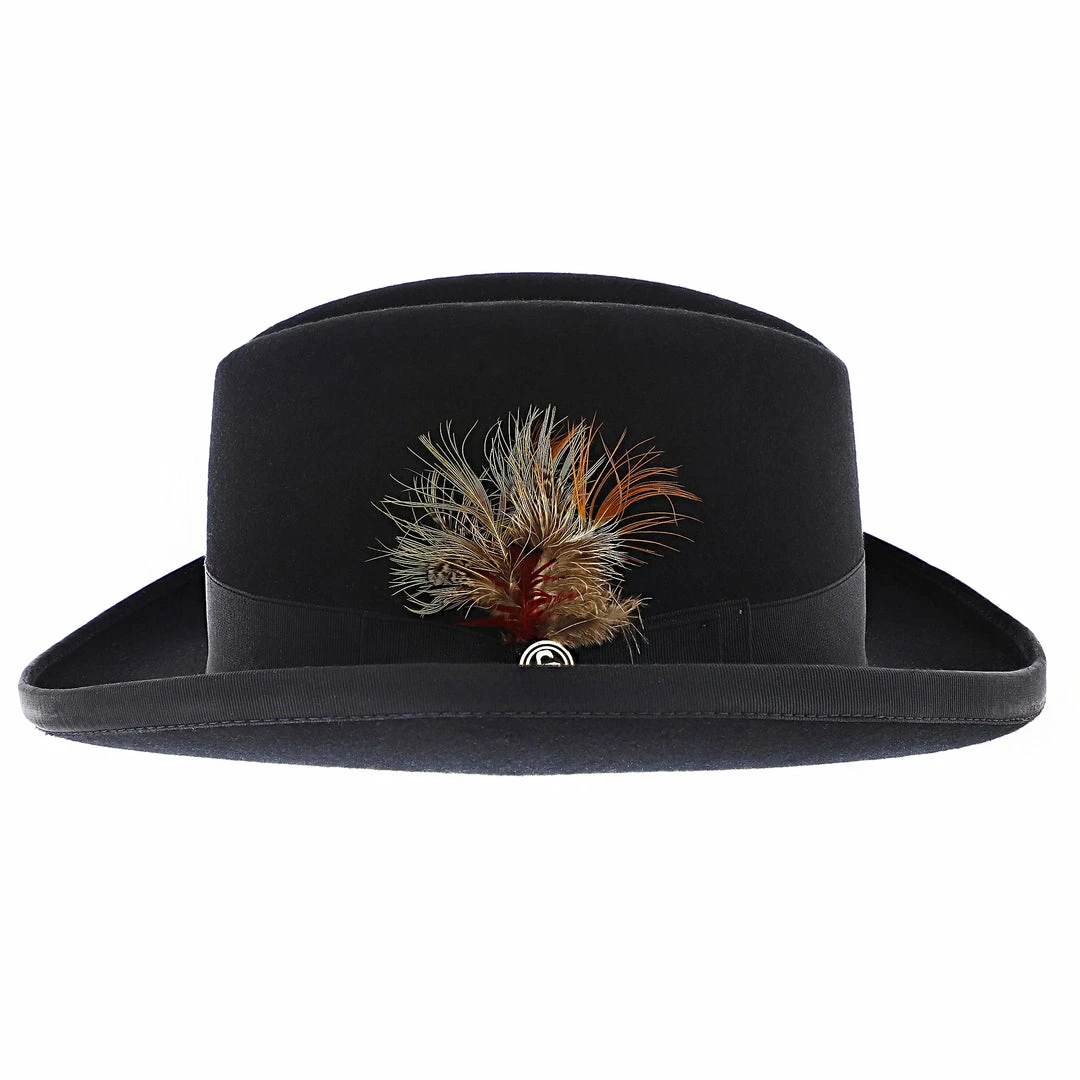 Made with a fine quality of Wool Felt, the Homburg Stetson Wool Felt Homburg is certainly sure to please in looks and comfortability while looking dapper at the same time. The wide black bowtie band with feather and Stetson pin gives the hat a very distinguished look. As in the old days, the short brim and center dent crown gives the hat that vintage look yet sophisticated style.
