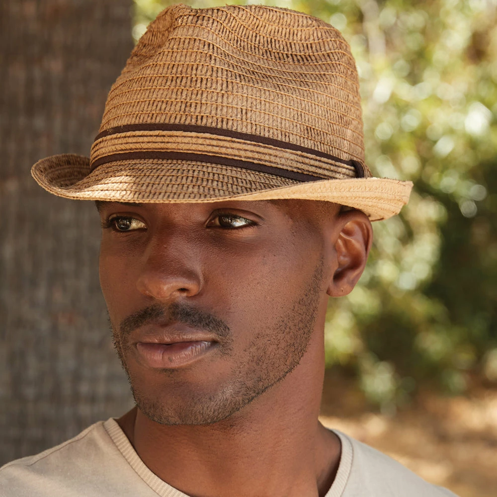 Laid Back Burnt Paper Braid Fedora from Dorfman Pacific. This fedora features a 1 3/4″ stingy brim& faux suede hat band.