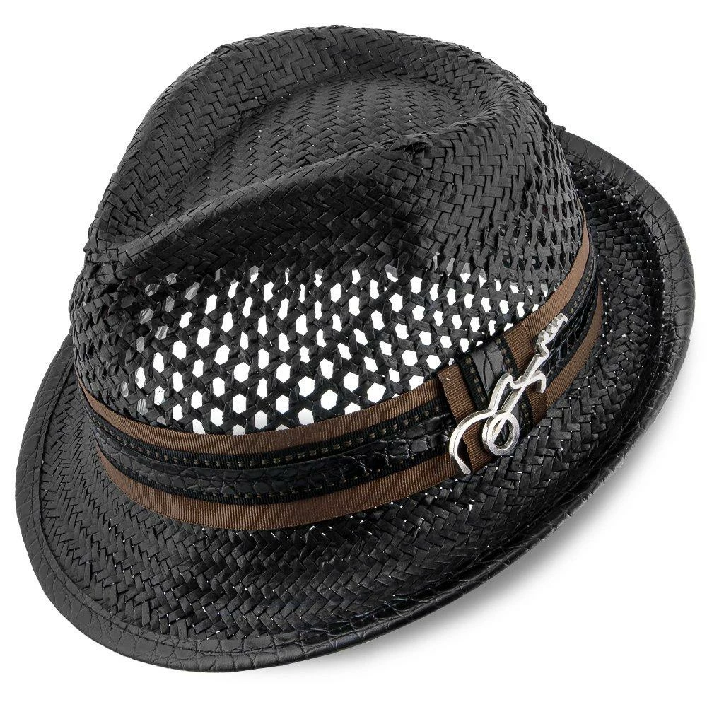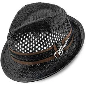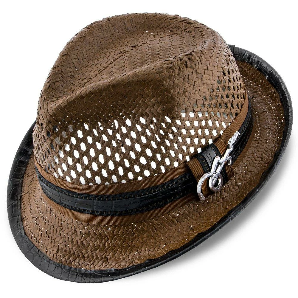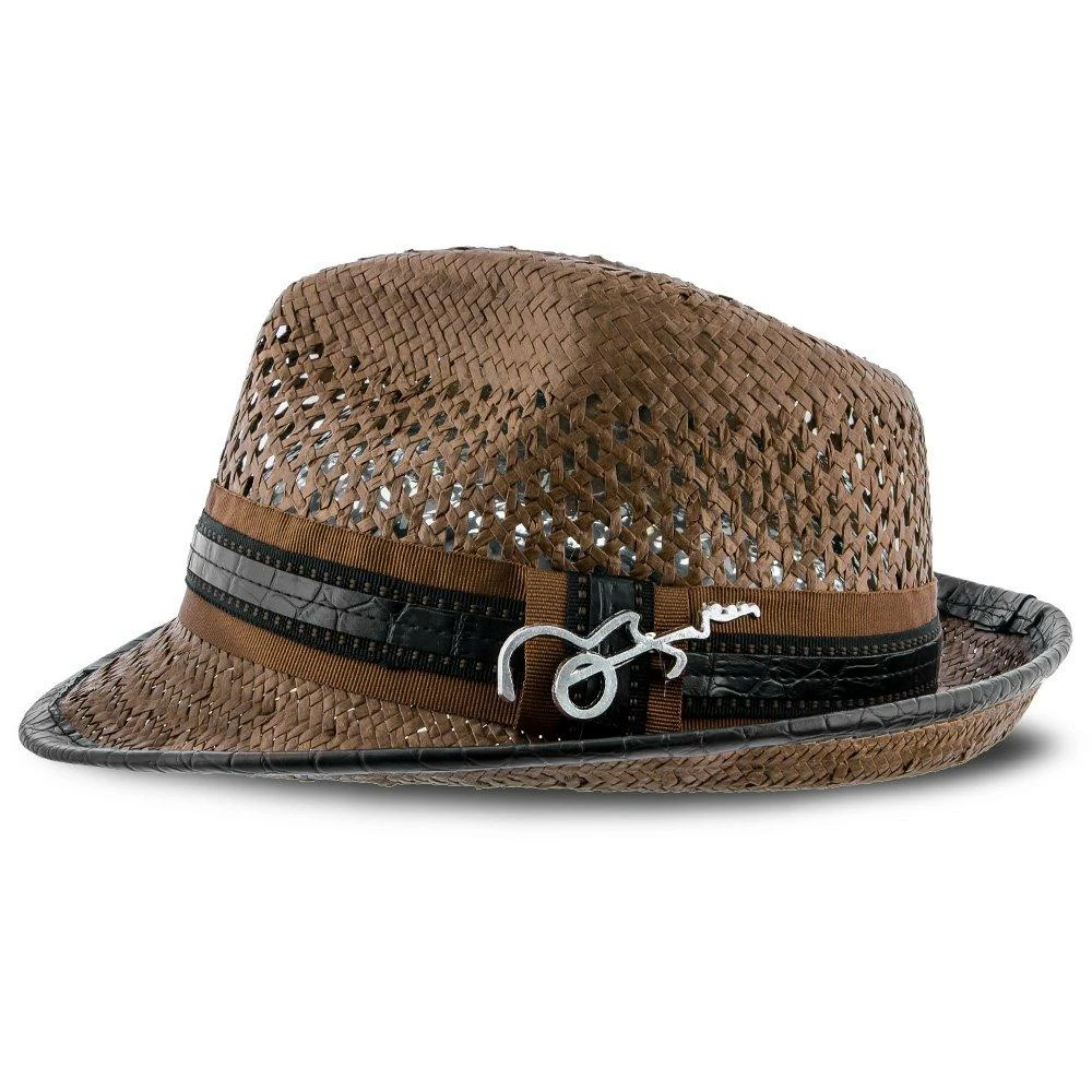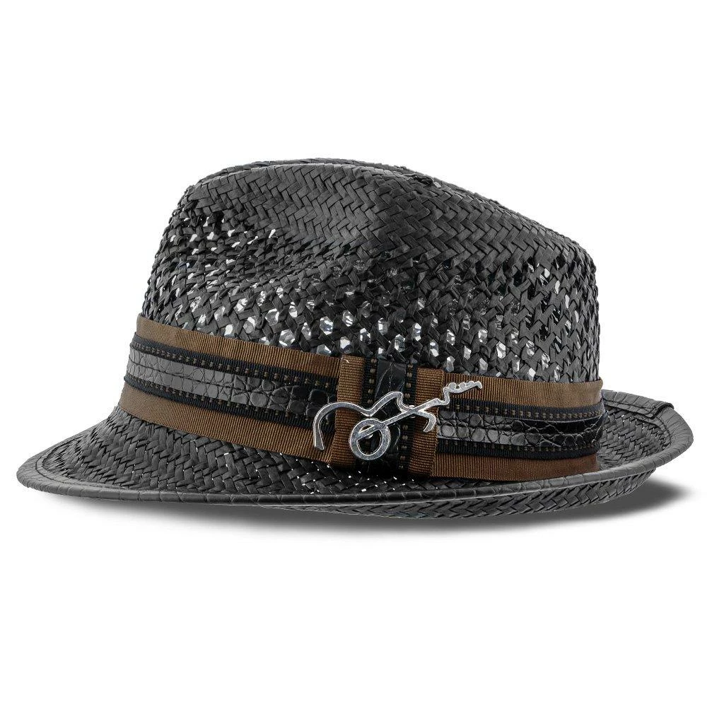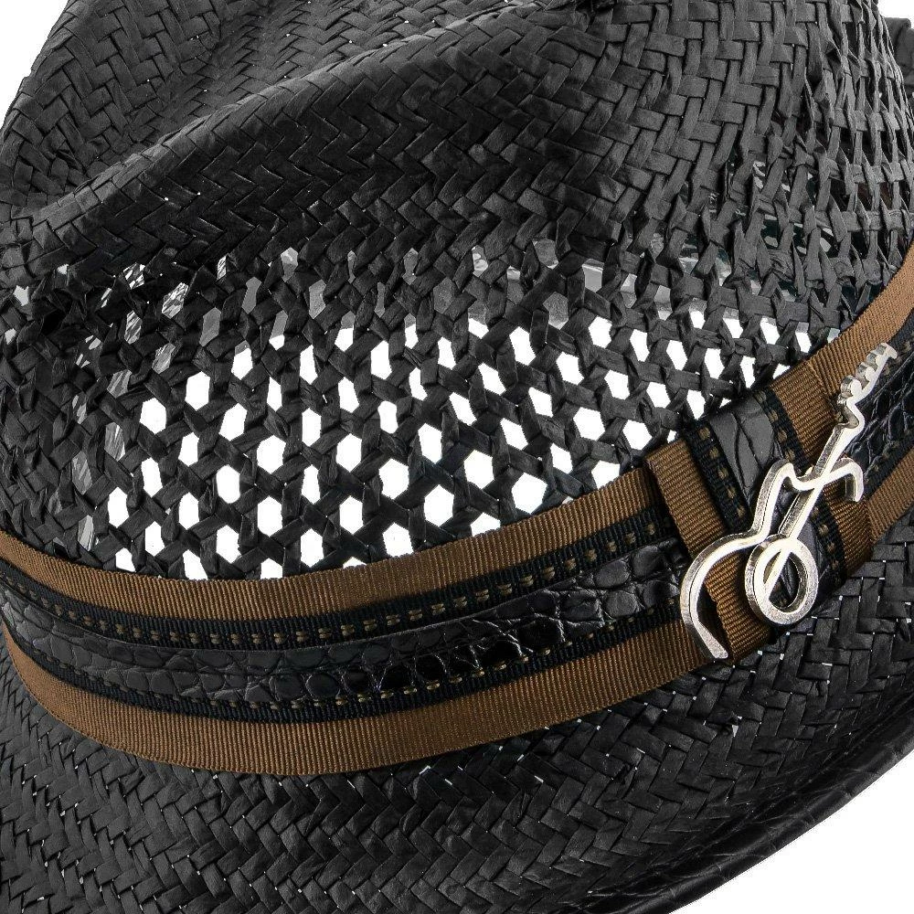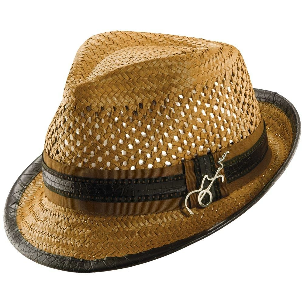 With huge ventilated gaps in the toyo straw, your head will stay super cool while you bask in the sun. And you’ll look awesome while doing it. A teardrop on top with generous dent pinches, it has all the fedora flair, but being a smaller hat with a stingy brim, it falls in the trilby classification. A matching grosgrain hatband with faux leather looks fantastic. We especially like the whimsical guitar pin Santana chose to include.