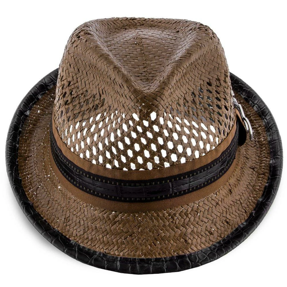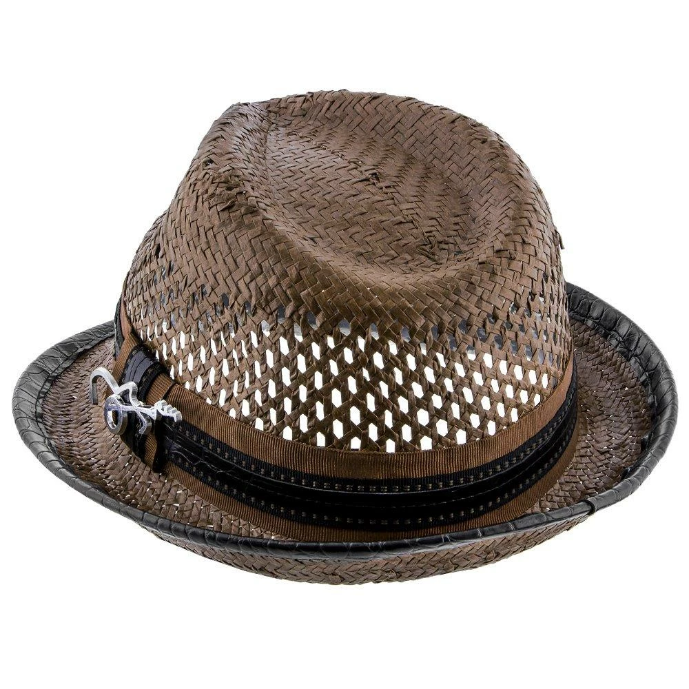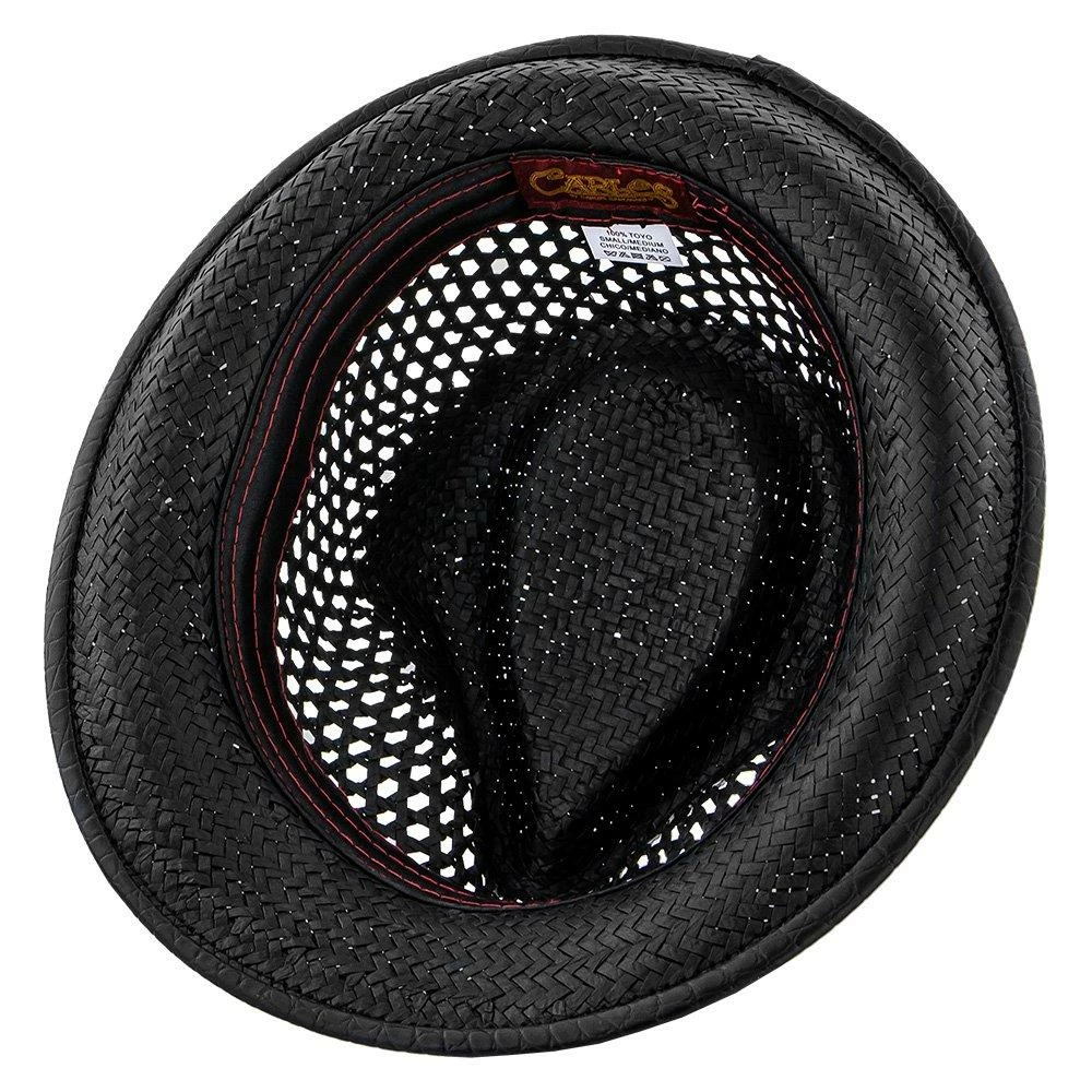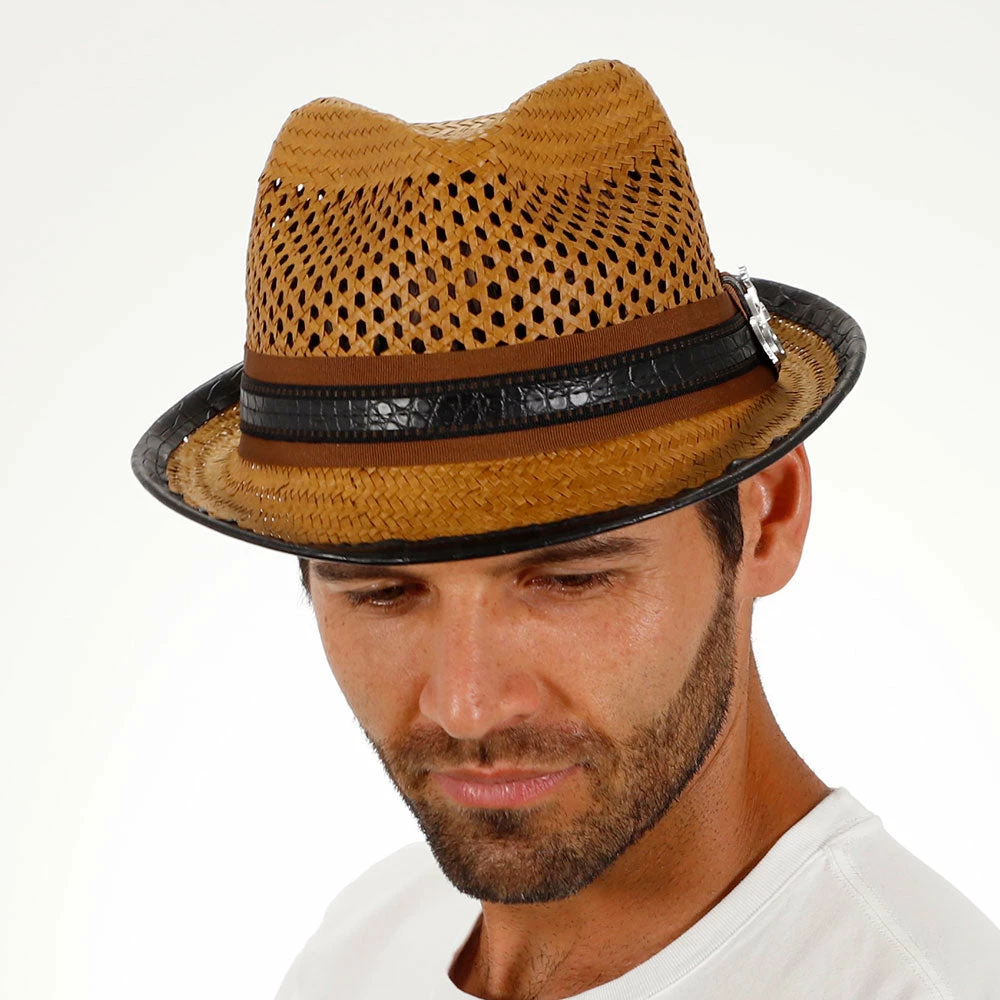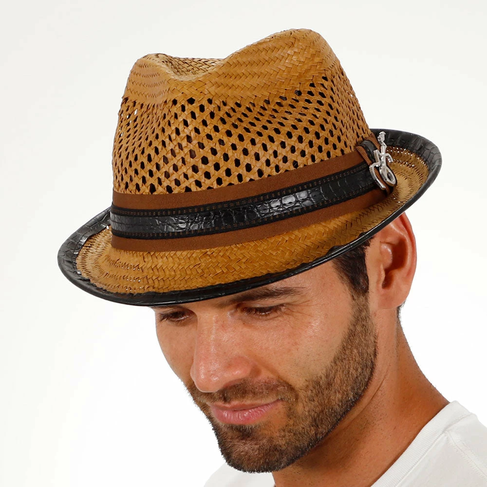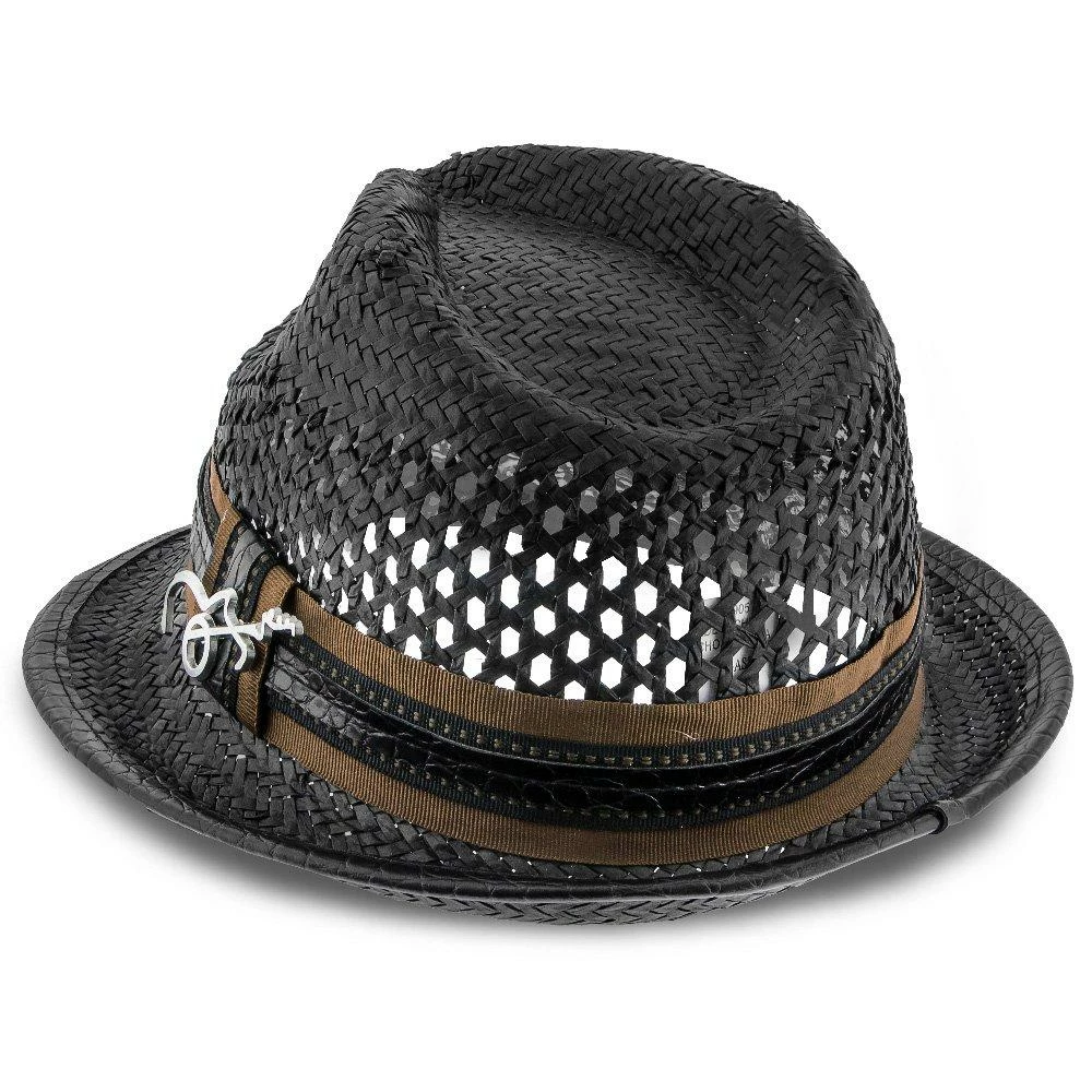 With huge ventilated gaps in the toyo straw, your head will stay super cool while you bask in the sun. And you’ll look awesome while doing it. A teardrop on top with generous dent pinches, it has all the fedora flair, but being a smaller hat with a stingy brim, it falls in the trilby classification. A matching grosgrain hatband with faux leather looks fantastic. We especially like the whimsical guitar pin Santana chose to include.
