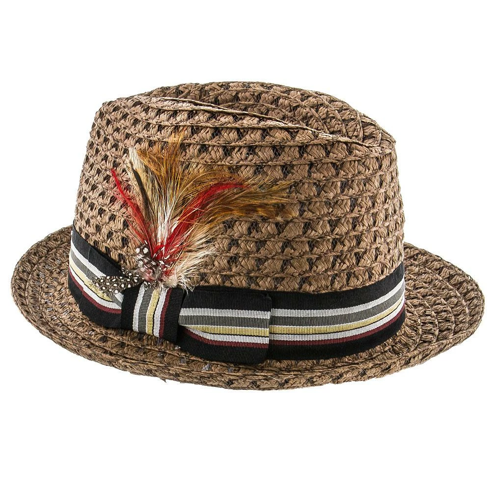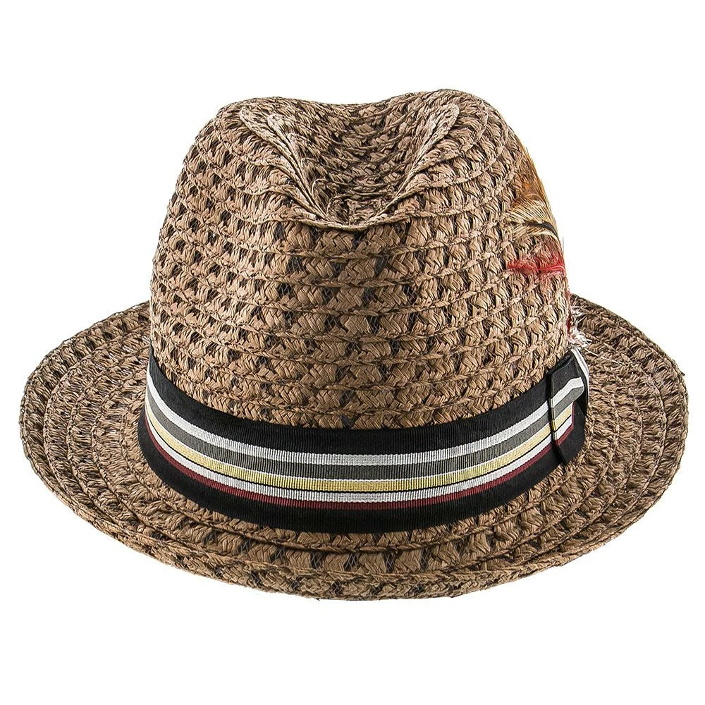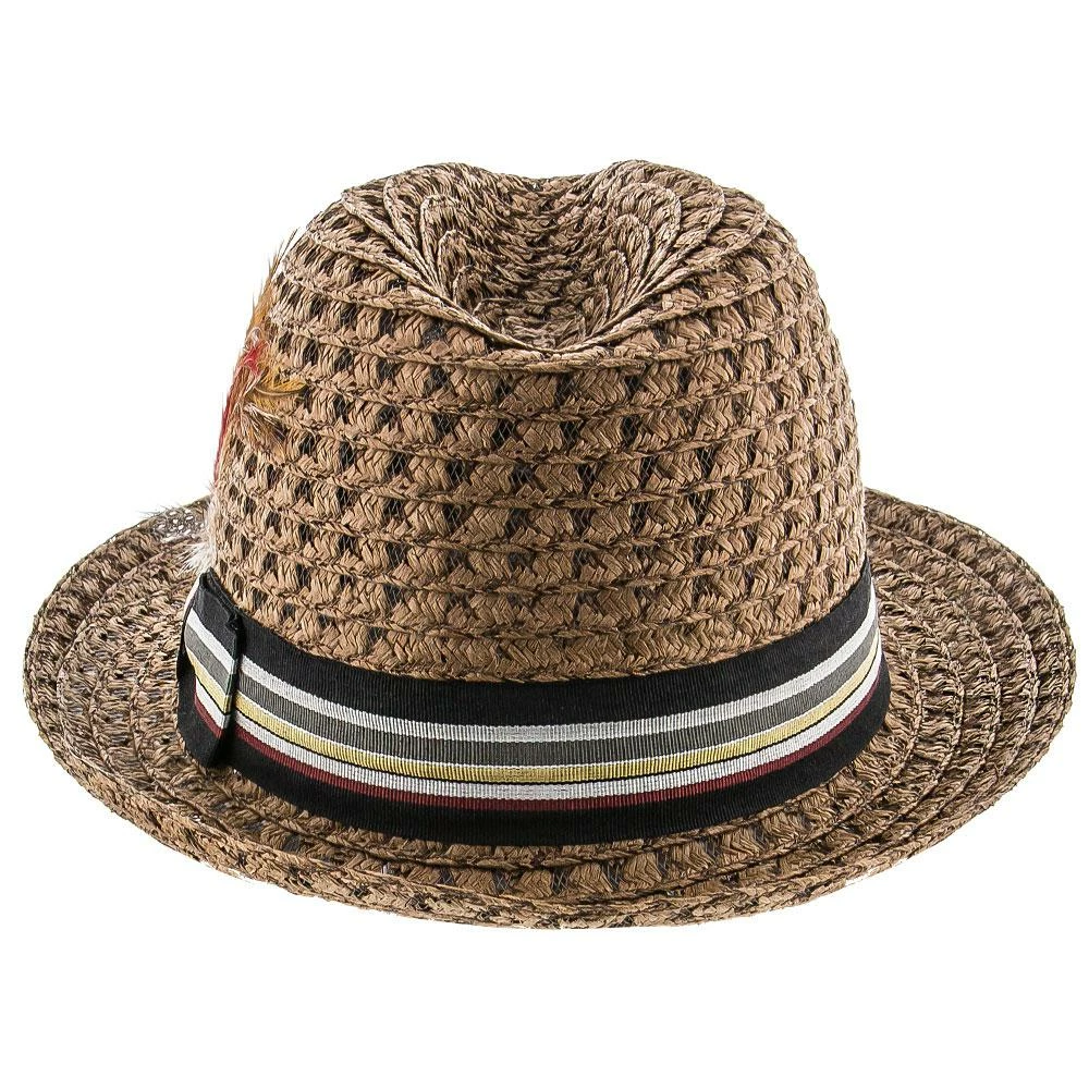 This stylish hat features Toyo fabric in a thick open weave to appear straw-like. There is a thick band and a matching feather to give it the dapper look. This is a fedora style with a “stingy brim” which means that it is the shortest brim available on a fedora. It is light weight and comfortable for summer days.