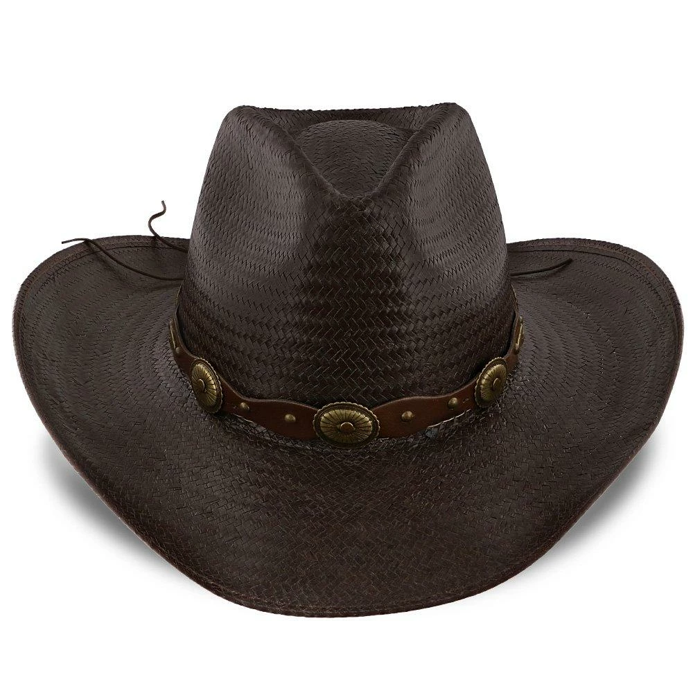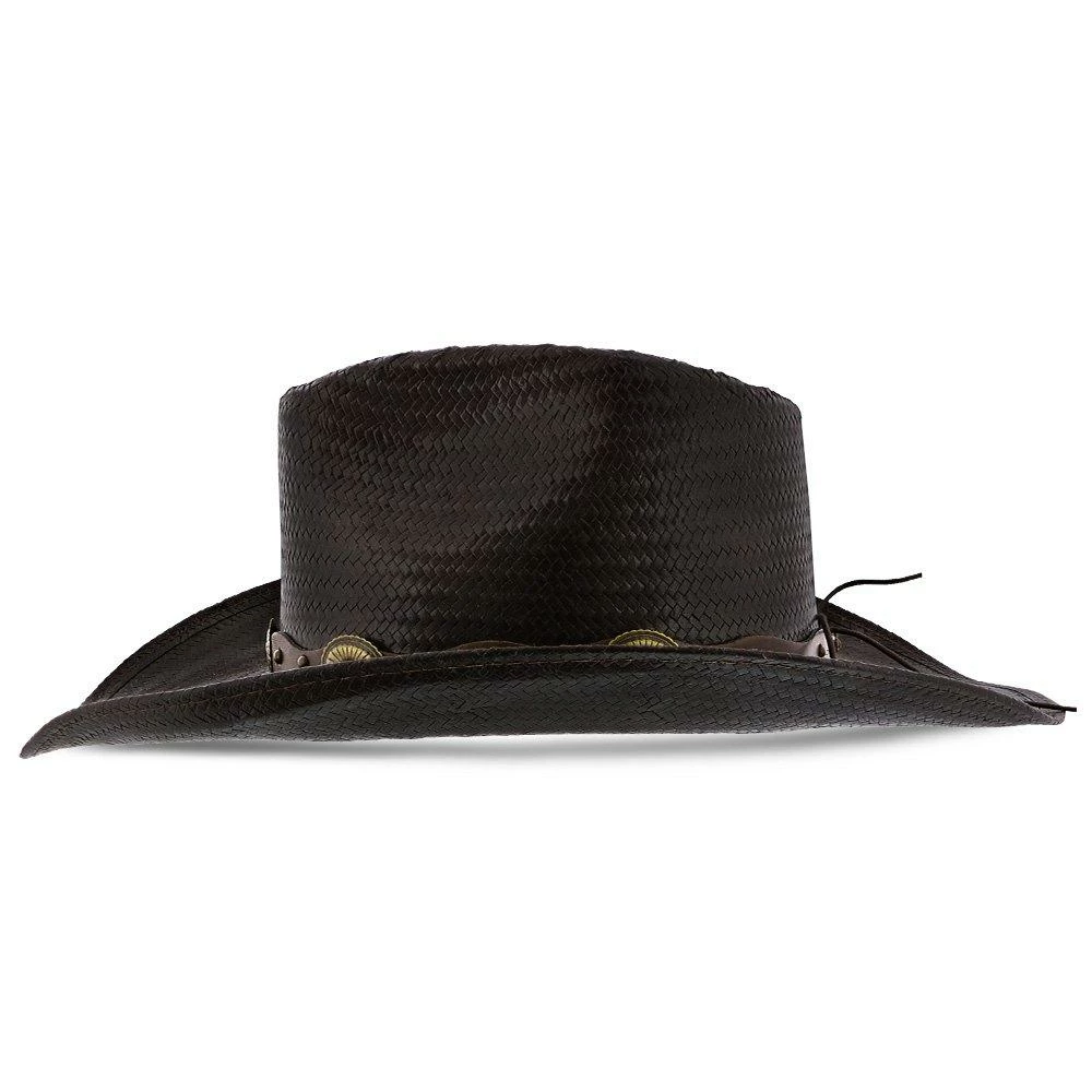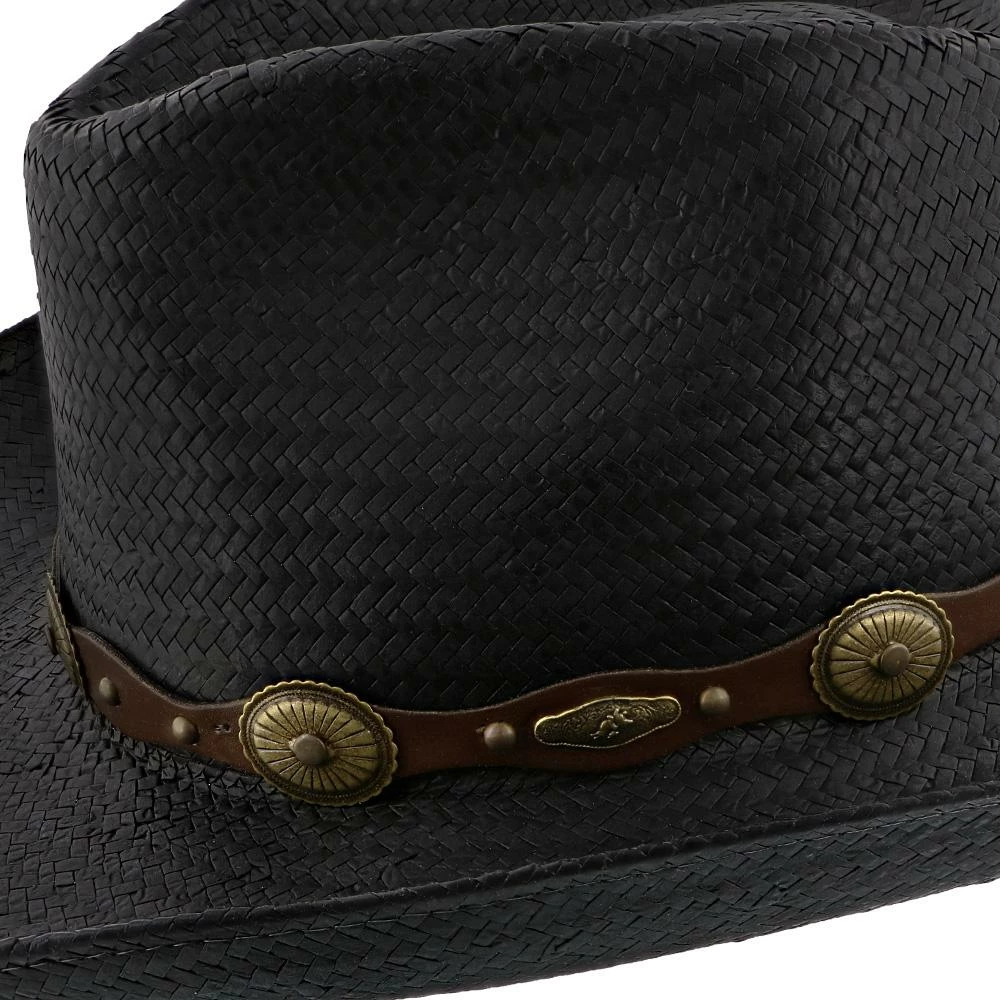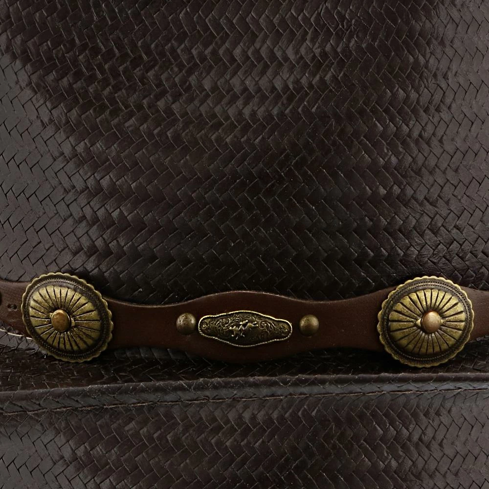 Enjoy a boot stompin good time while wearing the Roxbury Stetson Mocha Straw Western cowboy hat. This shapeable leather hat from the Rodeo Drive Collection by Stetson is sure to be an instant party starter. Also a favorite for avid outdoorsmen, this hat has a 3 1/2″ brim and leather hat band with decorative conchos.