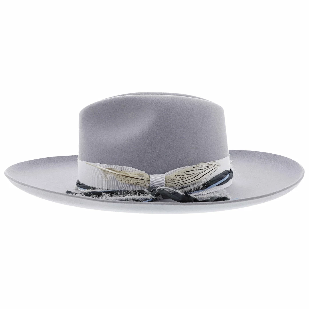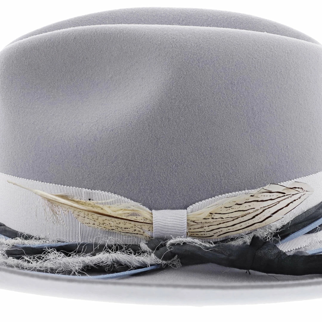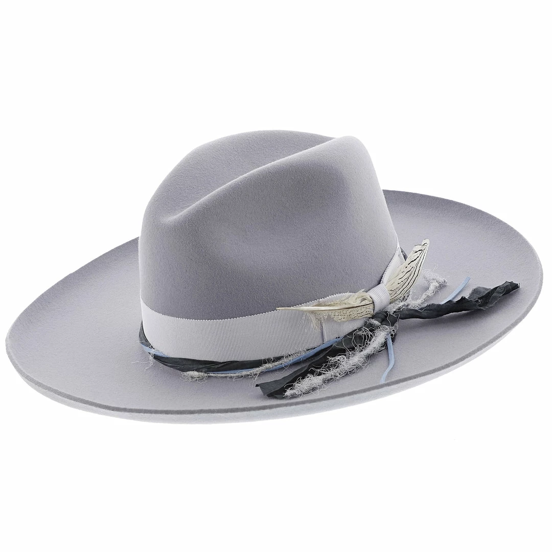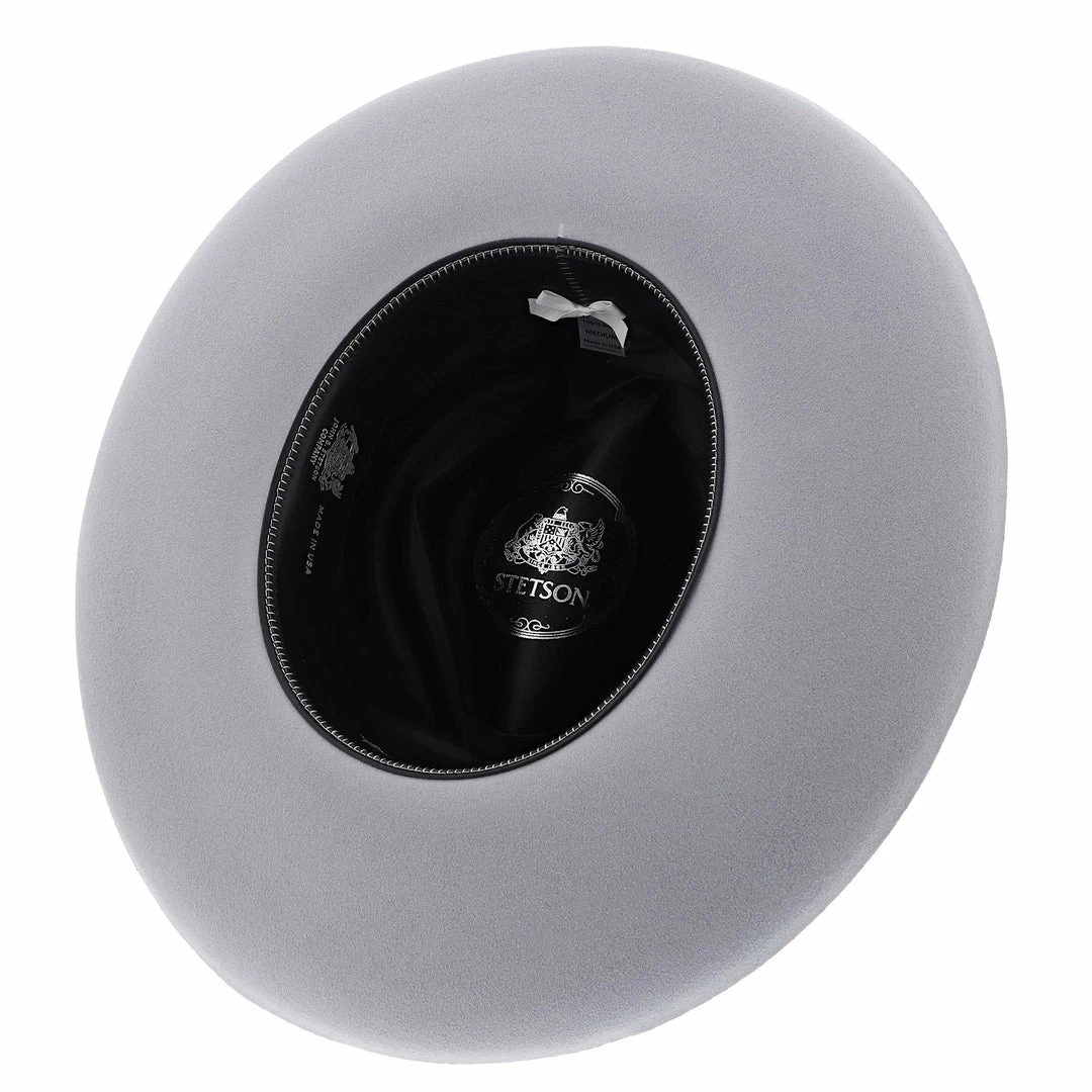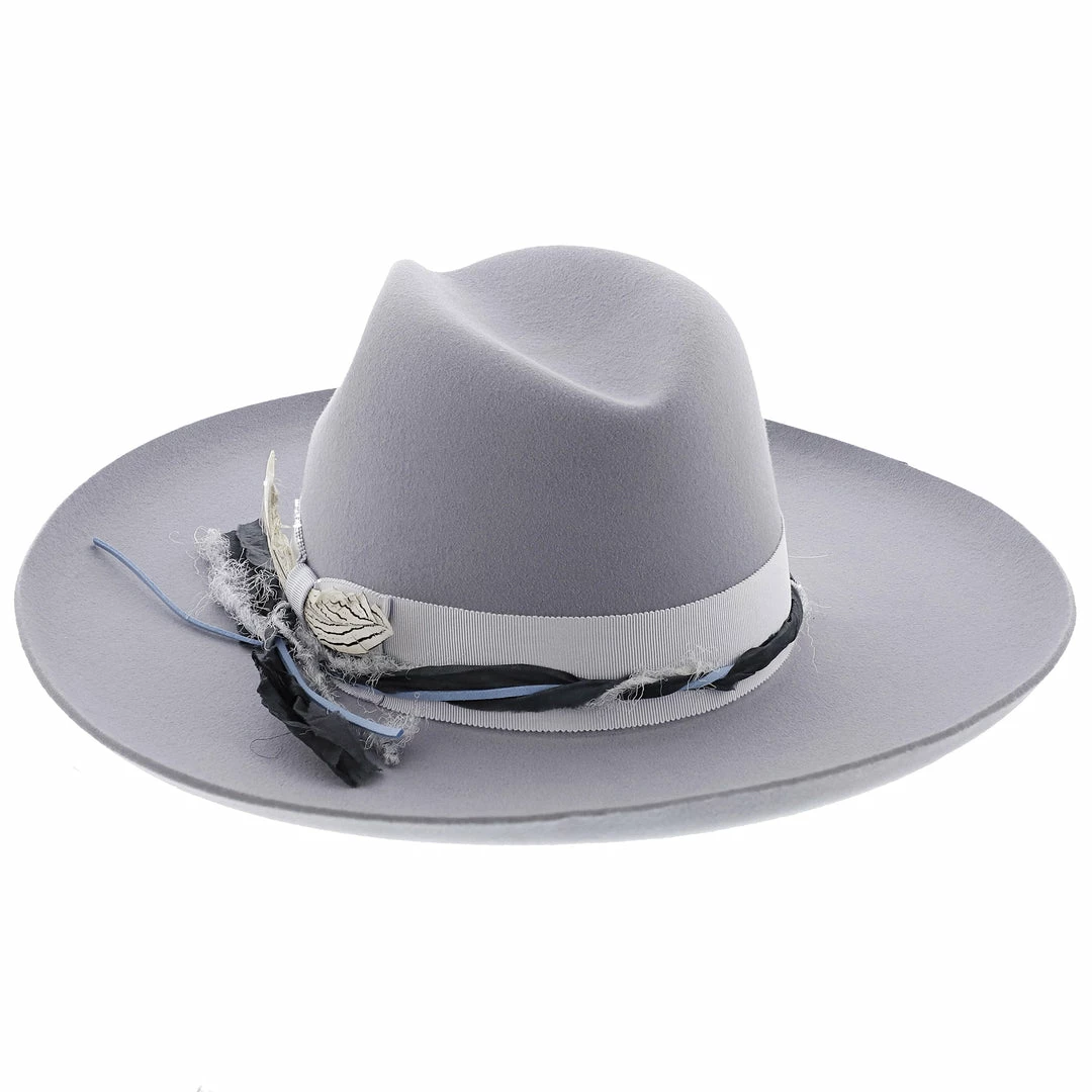 The Oceanus Hat by Stetson is yet another gem in the Seeker Collection by Stetson. It is a beautiful grey color with two hand dyes silk cords twisted together adorning the hat band. The brim is 4″ long with a pencil and stiff build.