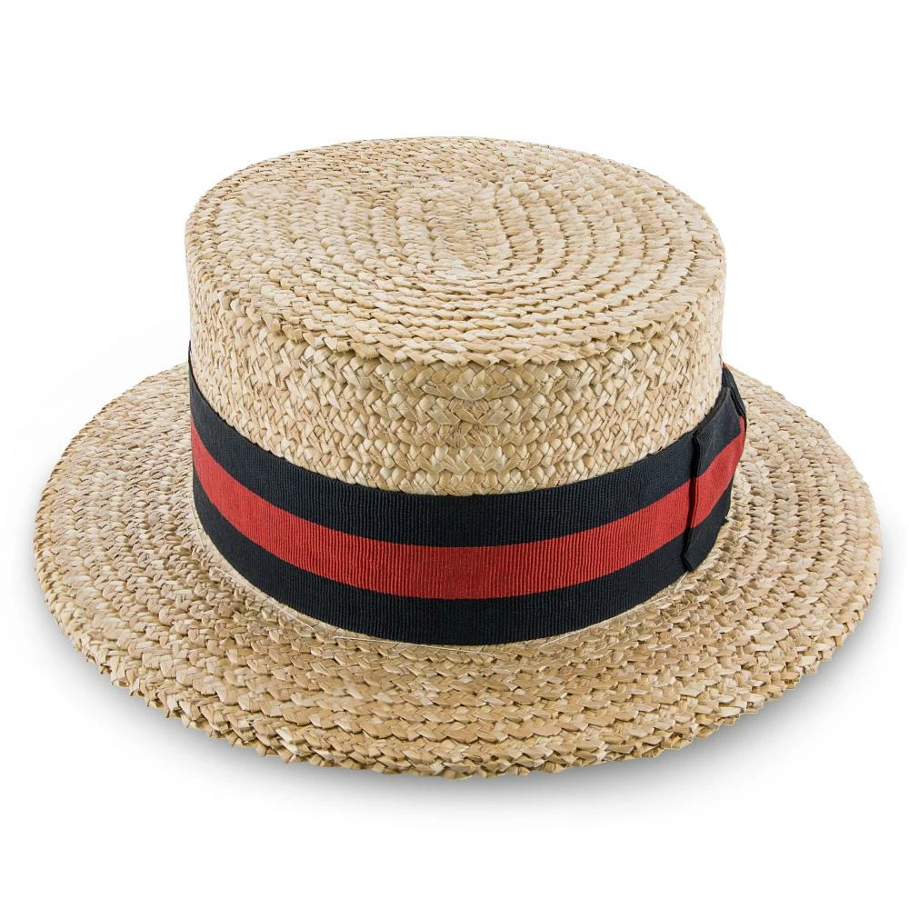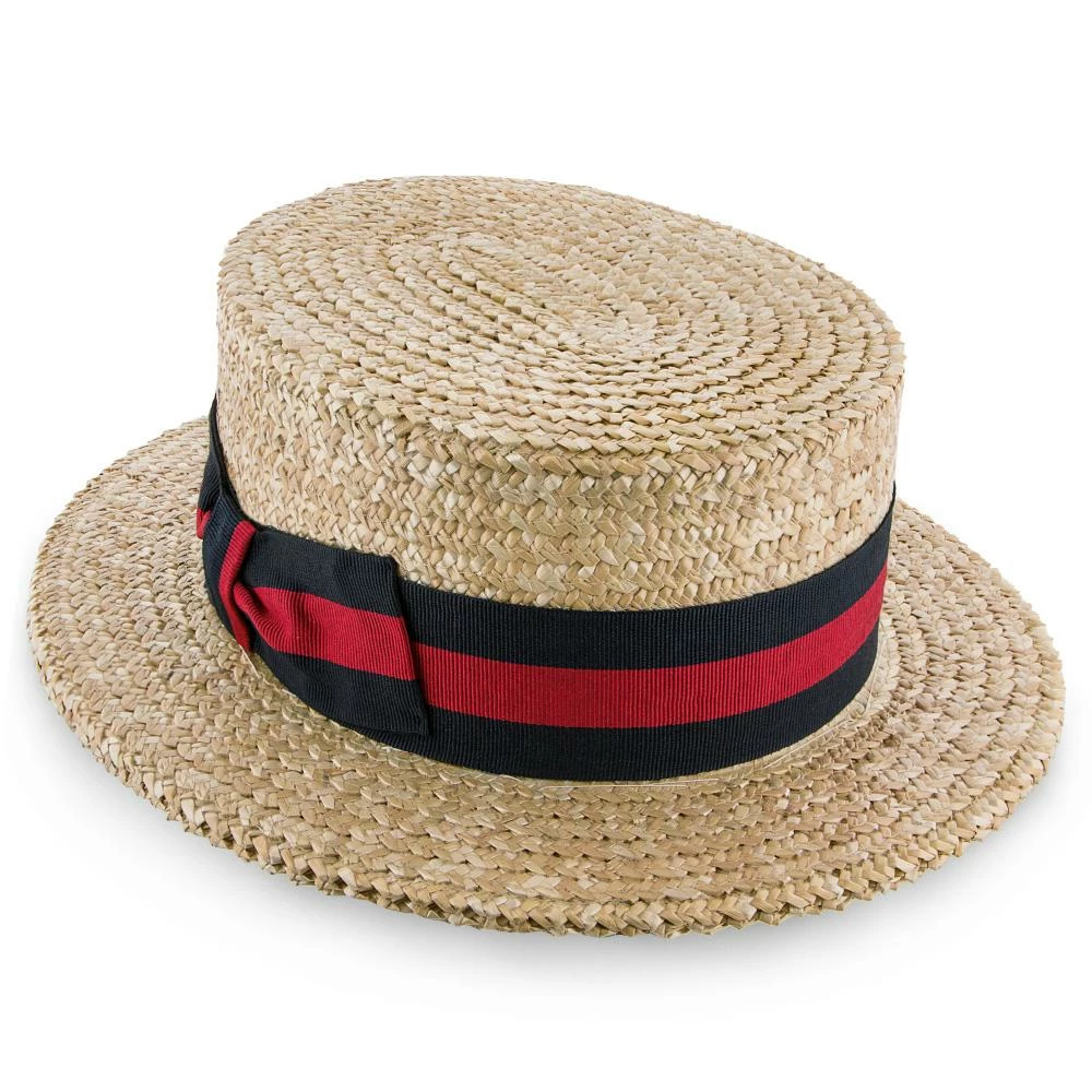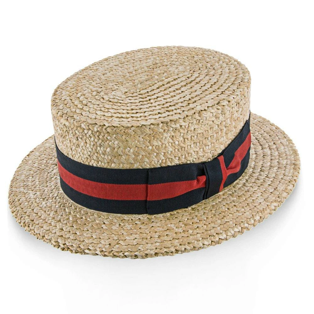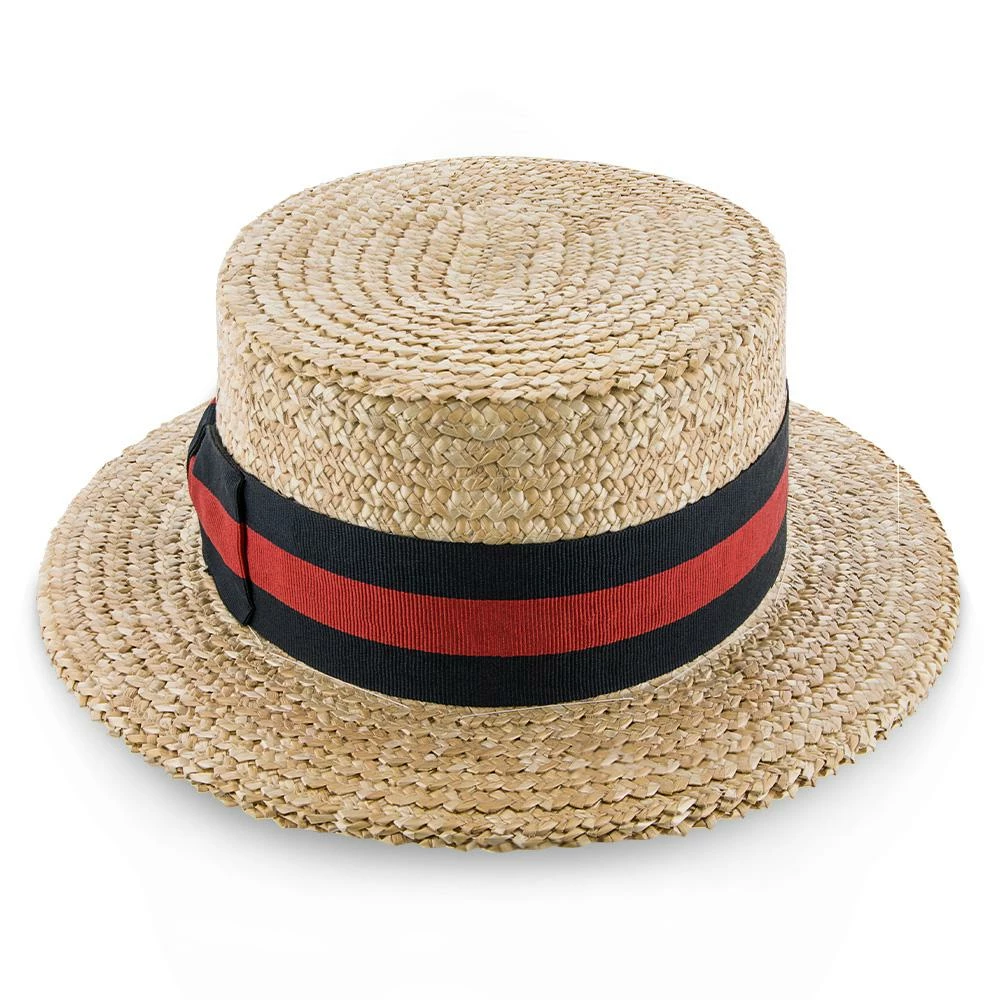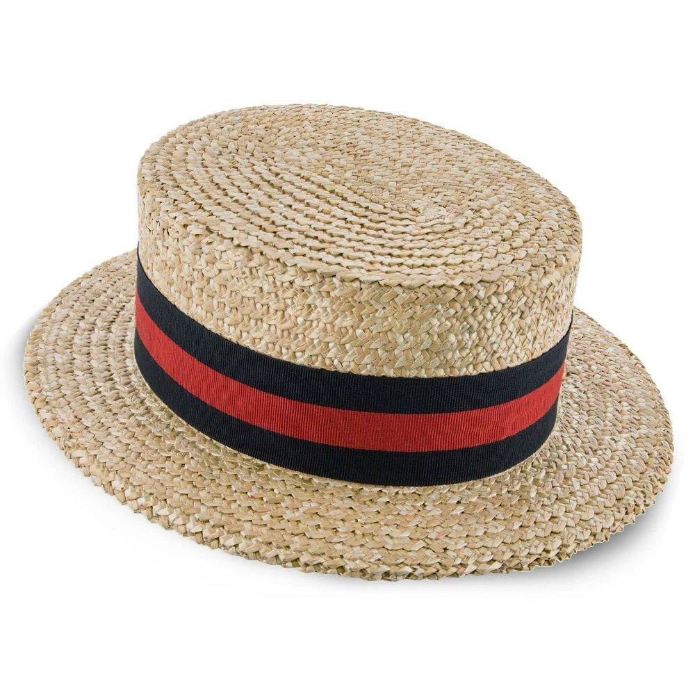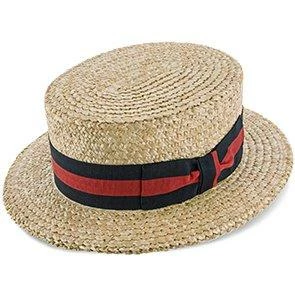 Channel your inner barbershop quartet dreams and sing for this Stetson Sennett straw boater hat. Stetson has meticulously crafted a gorgeous recreation of a timeless skimmer hat, going so far as to include the nautical styling of the navy blue and red grosgrain hatband. These hats were once popular by all sorts of fishermen, and are still prevalent in Italy, as Venetian gondoliers wear a similar style hat today. The hat is stiff to perfect cracker-like perfection, and though the stiffness will never lose its shape, the fine cowhide sweatband fits softly in place.