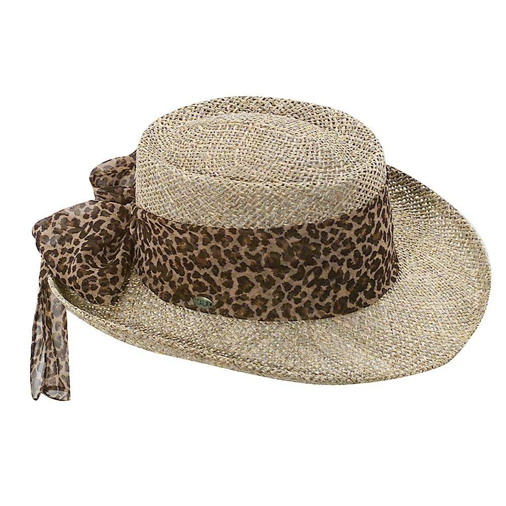 Wear the Scala LS106OS twisted seagrass gambler hat w/ animal print scarf featuring a 3-inch brim curling up slightly at the sides. The open weave material contrasts nicely with the wide scarf band depicting a brown background with prominent black leopard spots concluding with a large, fluffy bow showing off the Scala insignia. For a smart look blending favorably with a summer dress or pair of casual pants, a pair of chic sunglasses and a pair of tan leather sandals, this gambler hat is perfect for wearing to the casino, racetrack or a day spent at a favorite museum.