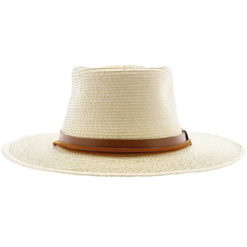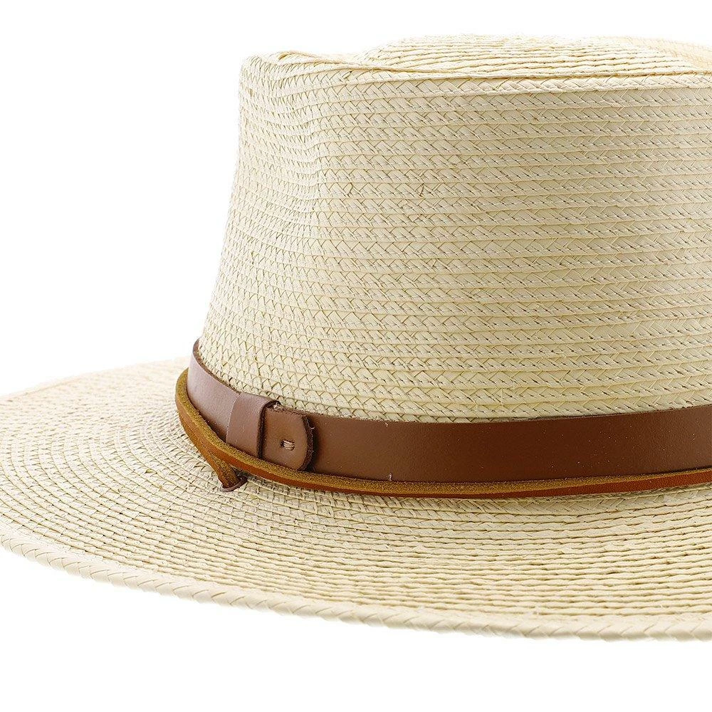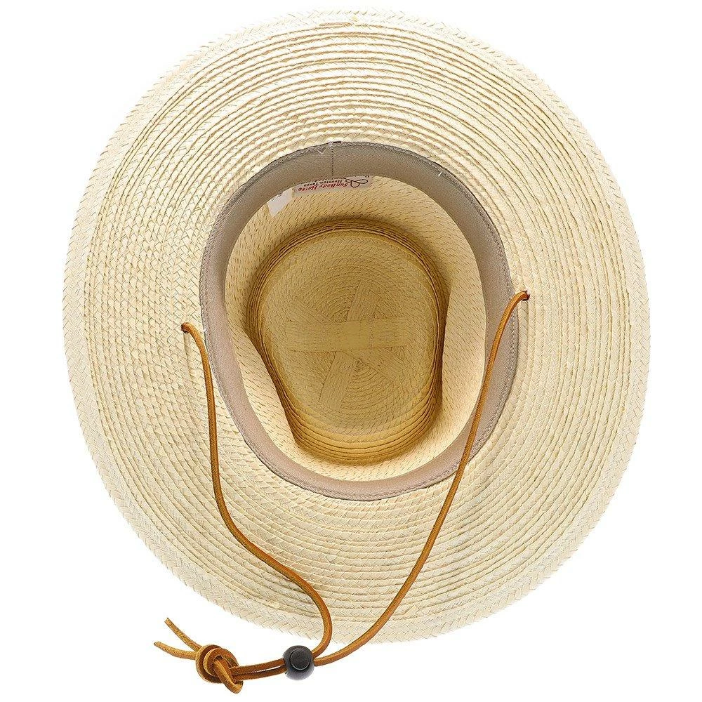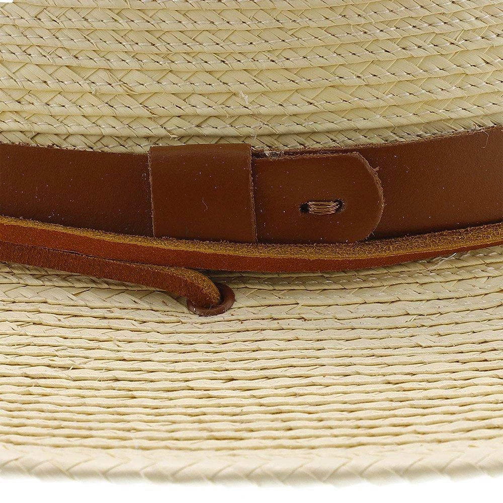 This natural hand-woven straw hat is a true masterpiece that combines utility and refinement in one stylish accessory. The Jacobรขโฌโขs Hat is a must-have accessory for savvy summer stylists who know how to dress for comfort and class. The light ivory tone of the straw contrasts beautifully with the rich, decadent caramel tone of the leatherette hatband. Also affixed to the hat is a brown suede chinstrap to ensure that the hat stays snug and secure on windy days. The brim width is approximately 3รขโฌย while the crown stands at roughly 5รขโฌย tall at its highest point.