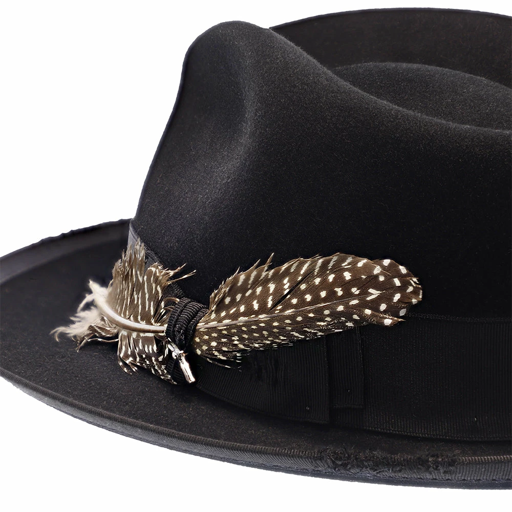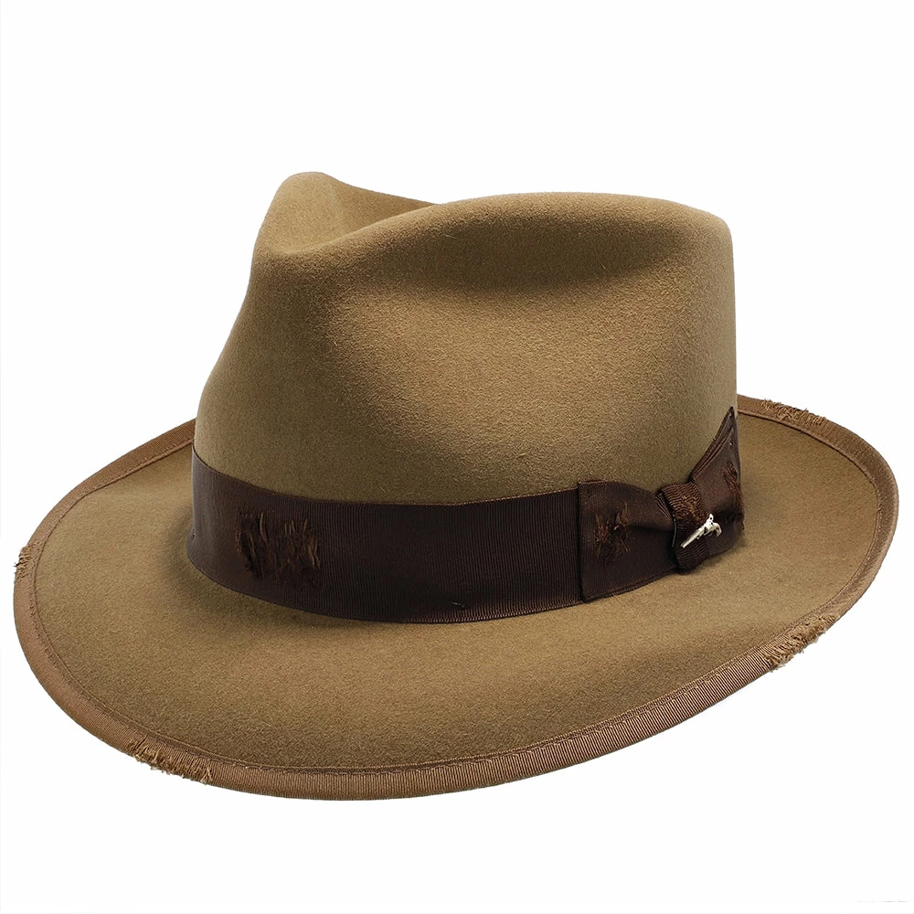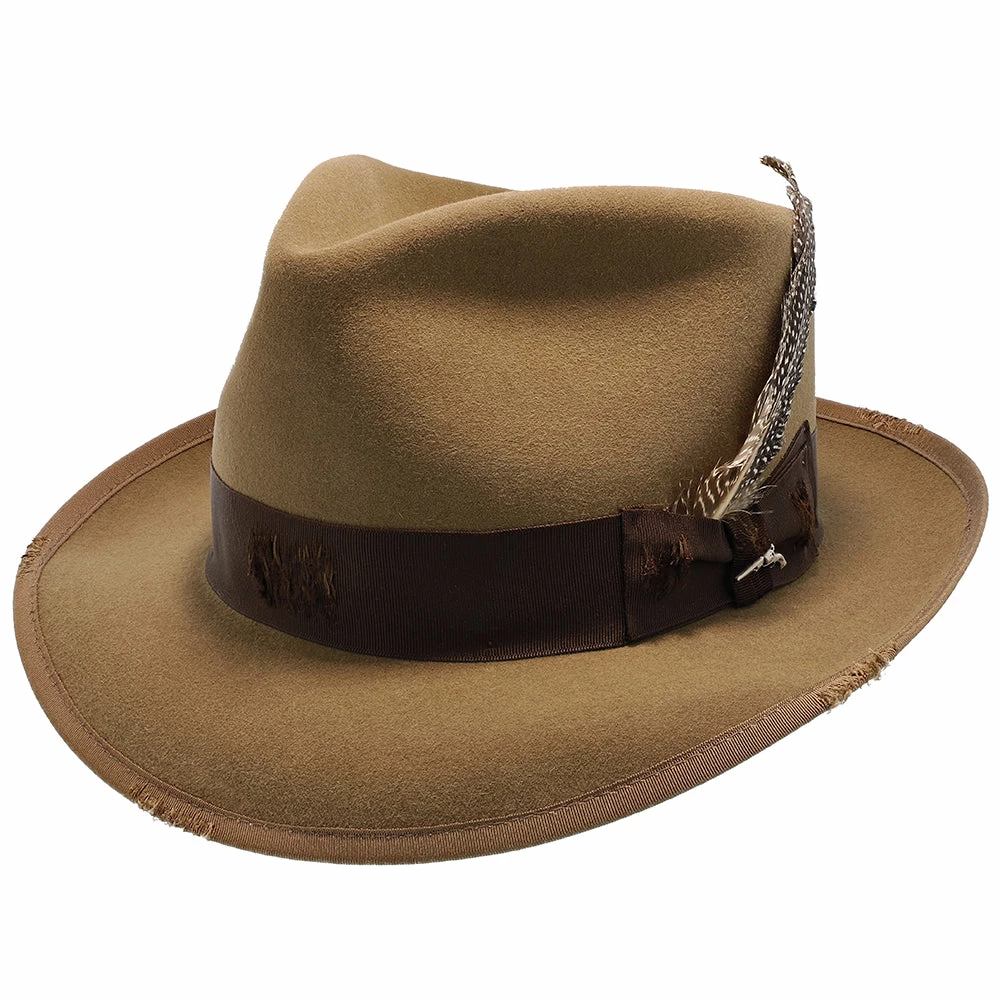 Whippet Distressed – Stetson Fur Felt Fedora Hat is a new version of the classic Stetson Whippet Hat. Made from a company that creates masterpieces from years of tradition. This distressed Whippet hat is yet another masterpiece of a hat. This hat has the same structural build as the Whippet but intentionally some Fibers have been strategically removed from the hat creating a slightly distressed look on the hat band and brim. This look of distressing is intentional and does not constitute damage. The finishing touch is a large removeable feather.