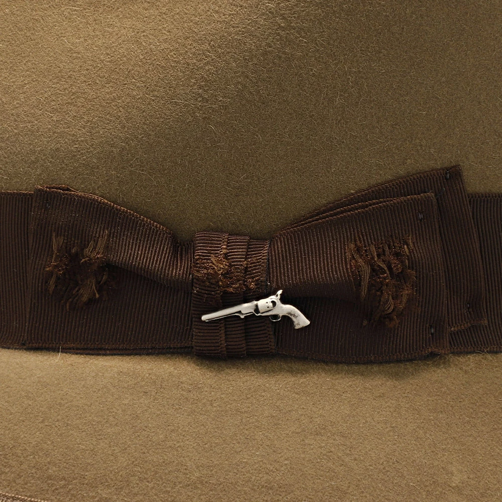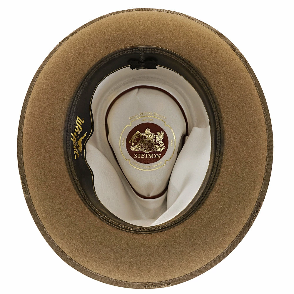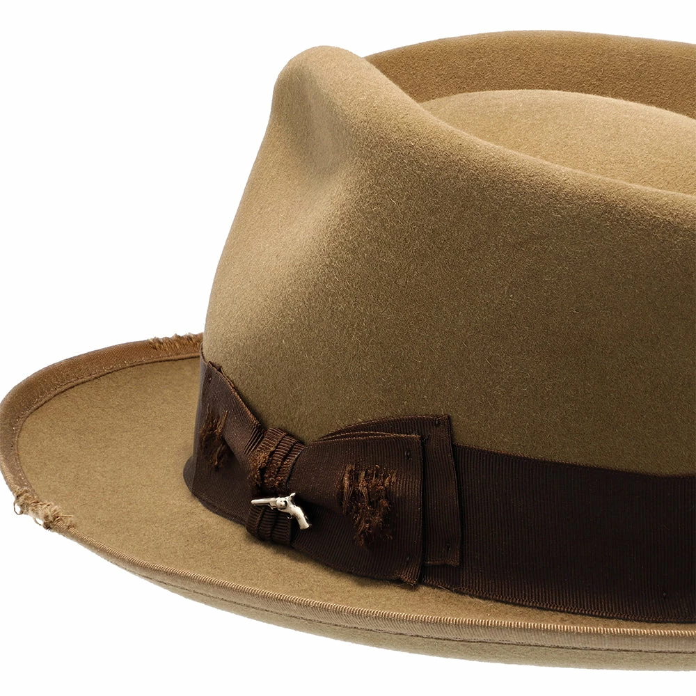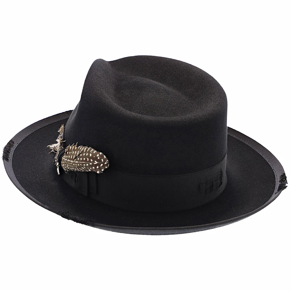 Whippet Distressed – Stetson Fur Felt Fedora Hat is a new version of the classic Stetson Whippet Hat. Made from a company that creates masterpieces from years of tradition. This distressed Whippet hat is yet another masterpiece of a hat. This hat has the same structural build as the Whippet but intentionally some Fibers have been strategically removed from the hat creating a slightly distressed look on the hat band and brim. This look of distressing is intentional and does not constitute damage. The finishing touch is a large removeable feather.